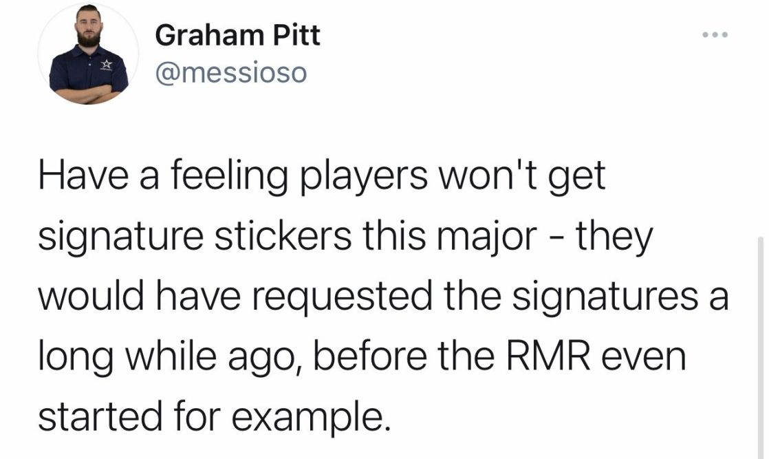 “我感觉选手们这次Major可能不会出个人贴纸了。Valve应该在老早一段时间前——例如在IEM秋季赛开打之前——就跟所有选手索要签名了。”