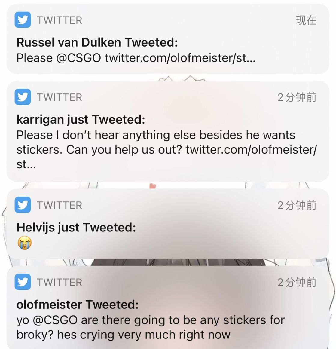 而在一小时前,兴许是FaZe队员们的整活,又兴许是真的急了,olofmeister直接@了CSGO官推,询问他们何时能来索要broky的贴纸: