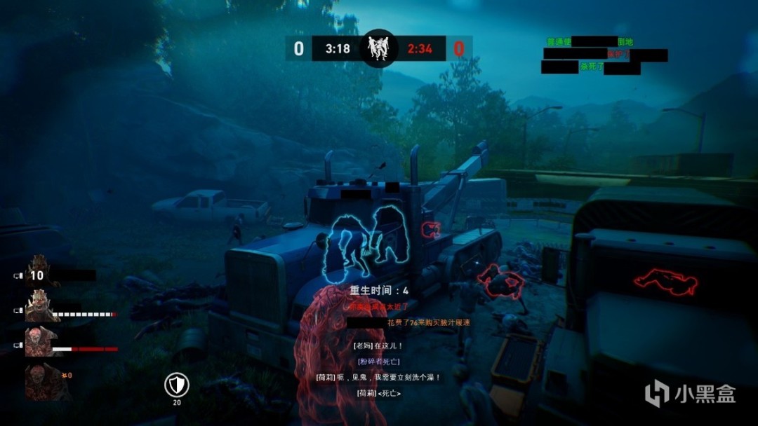 而扮演丧尸的一方可以从三大类、九种特殊丧尸中进行选择(种类数目有限制),并使用游戏中获得的突变点数进行全队强化。这个模式下的丧尸方玩家可以在人类方玩家的视角盲区无限复活,联合不断刷出的普通尸群和不断缩小的虫圈步步紧逼,只为了尽快绞杀人类方玩家。同时,丧尸可以通过有特殊标记的地方爬墙,居高临下进行偷袭,比如在敌人群聚的时候一口老痰,杀伤力巨大。