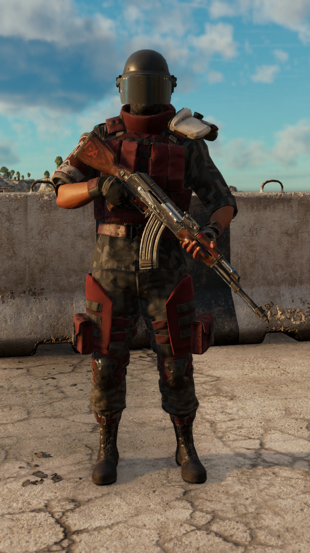 国防军手枪兵身着红白军服和灰色裤子,这是雅拉国防军的标准制服。手枪兵会戴一顶贝雷帽,同时配一条比突击手更简陋的胸挂用以挂载武器。长官的裤子则是灰色迷彩样式的,所有的国防军长官制服配色皆以此为基础。