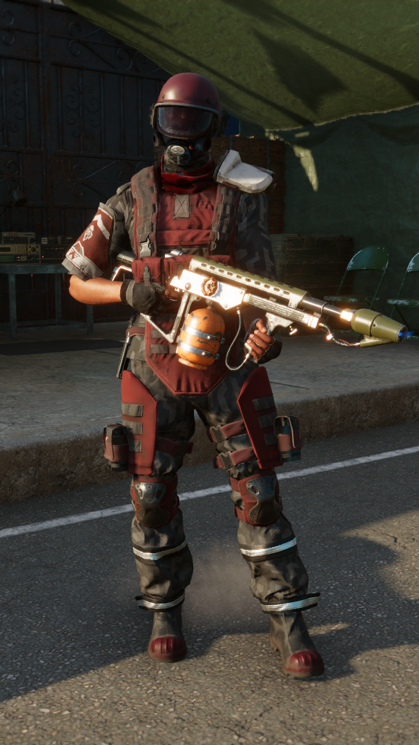 特种部队火焰兵身着灰色迷彩防火服,穿着红色的防弹护甲,戴防弹头盔和毒气防护面具。