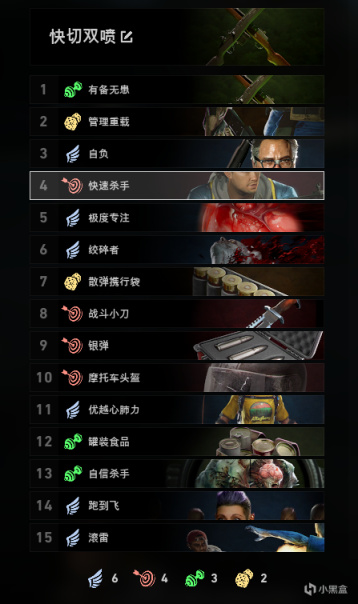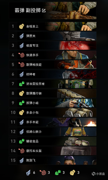 霰弹输出原理和上面是一样的,这里额外多了切枪和双持卡,利用开枪切枪,配合收枪装填(霰弹是收起立刻一颗一颗装填),做到双枪循环输出,无需换弹。打特感和清尸潮很方便,缺点:有一点废子弹。