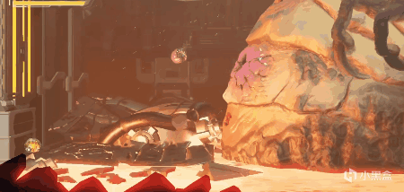 但和很多游戏打破常规流程=卡BUG=看到游戏贴图后最真实的一面不同,现在看来,《银河战士:生存恐惧》的游戏设计师完全考虑到了玩家这一操作的后果——在上面这段GIF的流程后面萨姐会遇到一个被铁链囚禁的BOSS克雷德,如果按照正常打法,它有两个阶段,第二阶段需要不断交替着攻击它的肚脐和头。