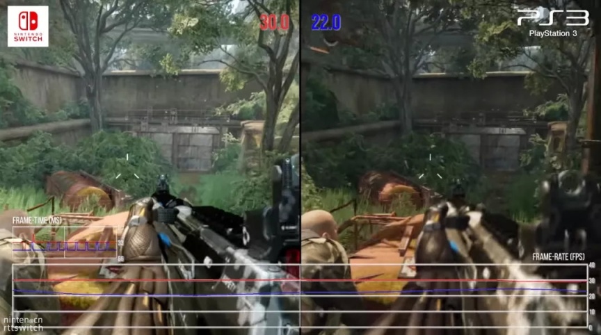 我特意搜了下数毛社很早之前的switch版孤岛危机3早期的测试版 VS ps3原版的对比视频。图中可以看出ns版不仅拥有全局光照效果而且帧数已经是大幅度超越ps3了。