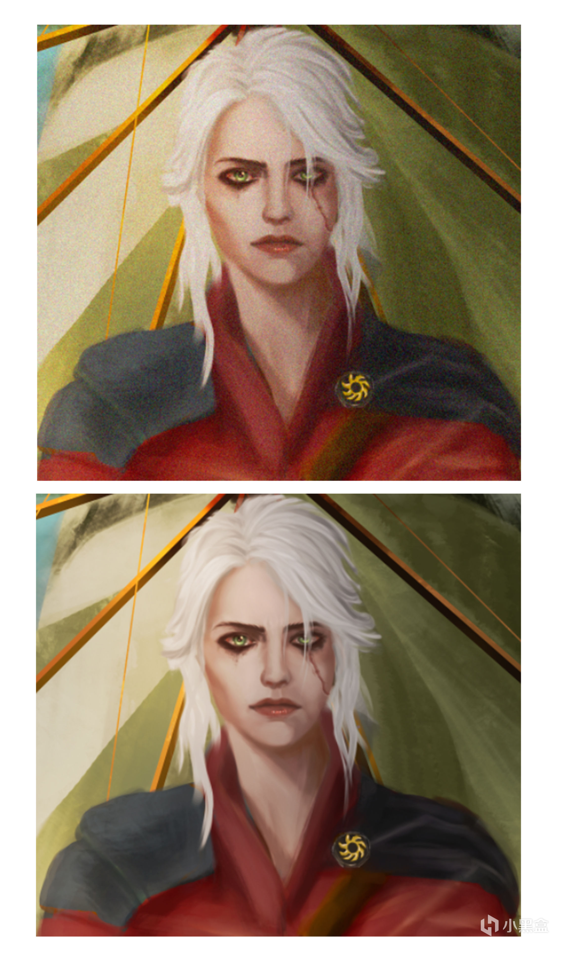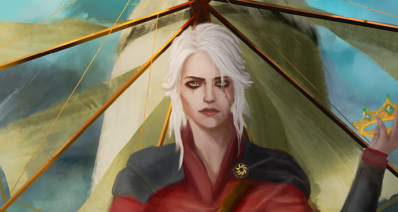 心中设想的是强化一下她对于这两个不同命运的态度。左半边的阳光、燕群与手持的剑——吉微艾尔,与看起来相对脉络清晰的山峰,代表她的新征程。右半边,身穿尼弗迦德的披风、手举皇冠。天空上方的乌云久久未散...看不清的山岗,被浓厚的云雾遮挡。