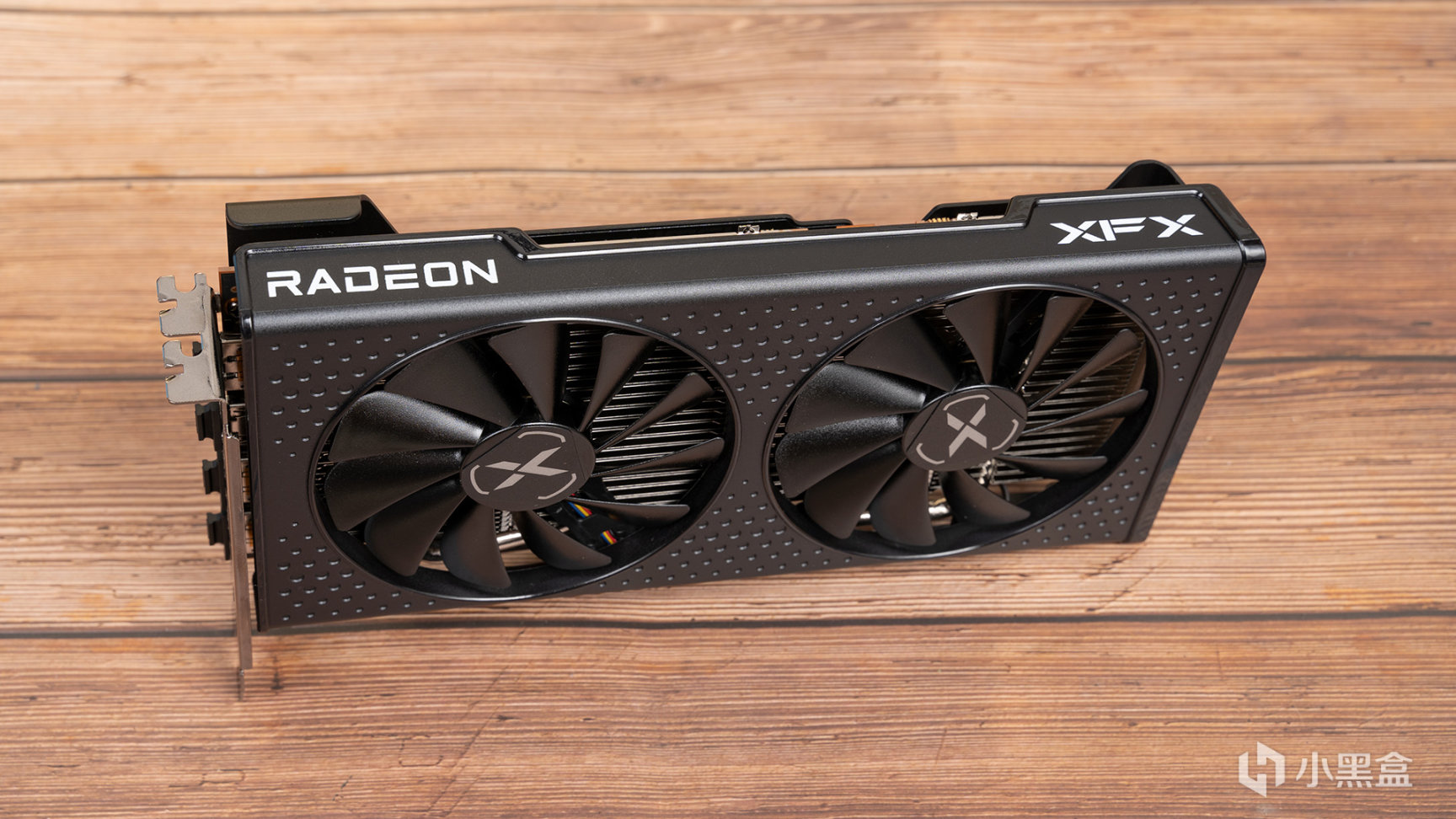 三款显卡均来自XFX讯景,第一款是RX 6600黑狼版,整体造型线条感和棱角感并不强,没有任何花里胡哨的元素,配备单个8pin供电接口,RX 6600本身只有132W TGP也就能很好满足,整体散热规格较为保守,采用两枚10cm大尺寸静音风扇设计,整卡长度只有24.1CM适合大多数更迷你的机箱。