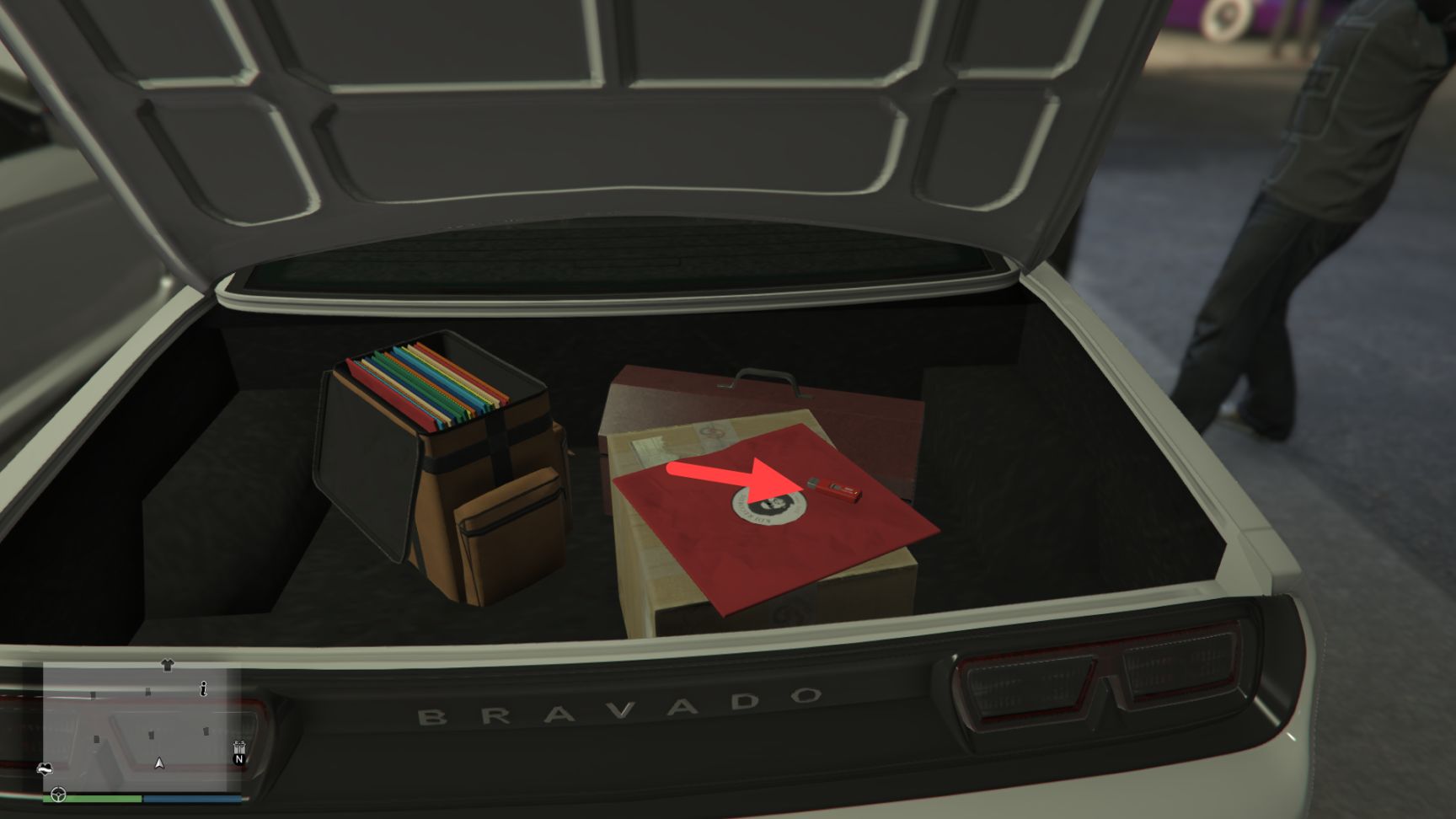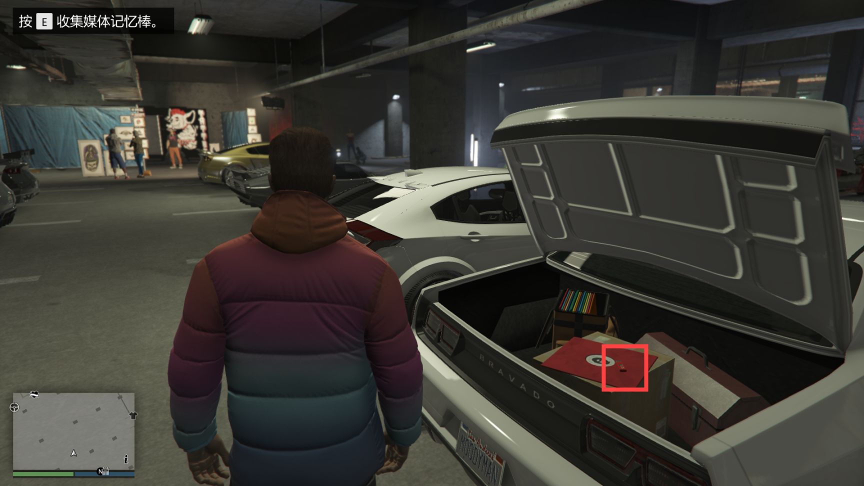 完成2个穆迪曼的请求任务后回到车友会,在里面找一辆白色车尾箱打开的车,这辆车就是穆迪曼的,第5个媒体记忆棒就在车尾箱里。(这里这辆车有可能刷不出,多进出几次车友会就行)