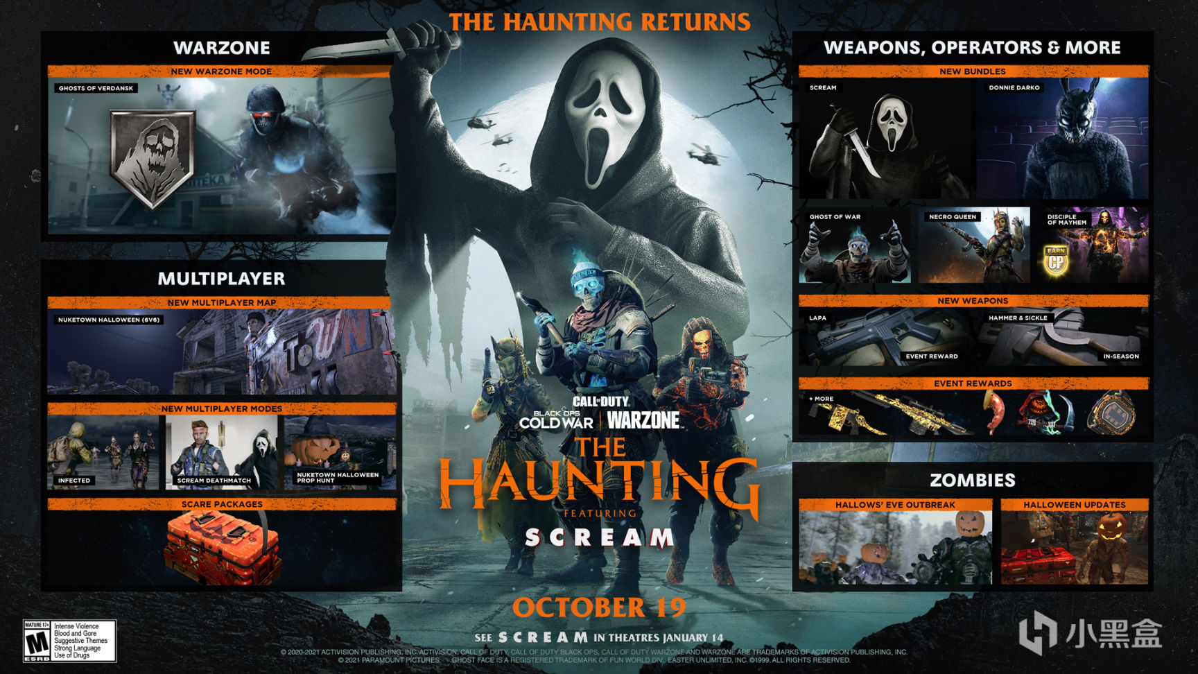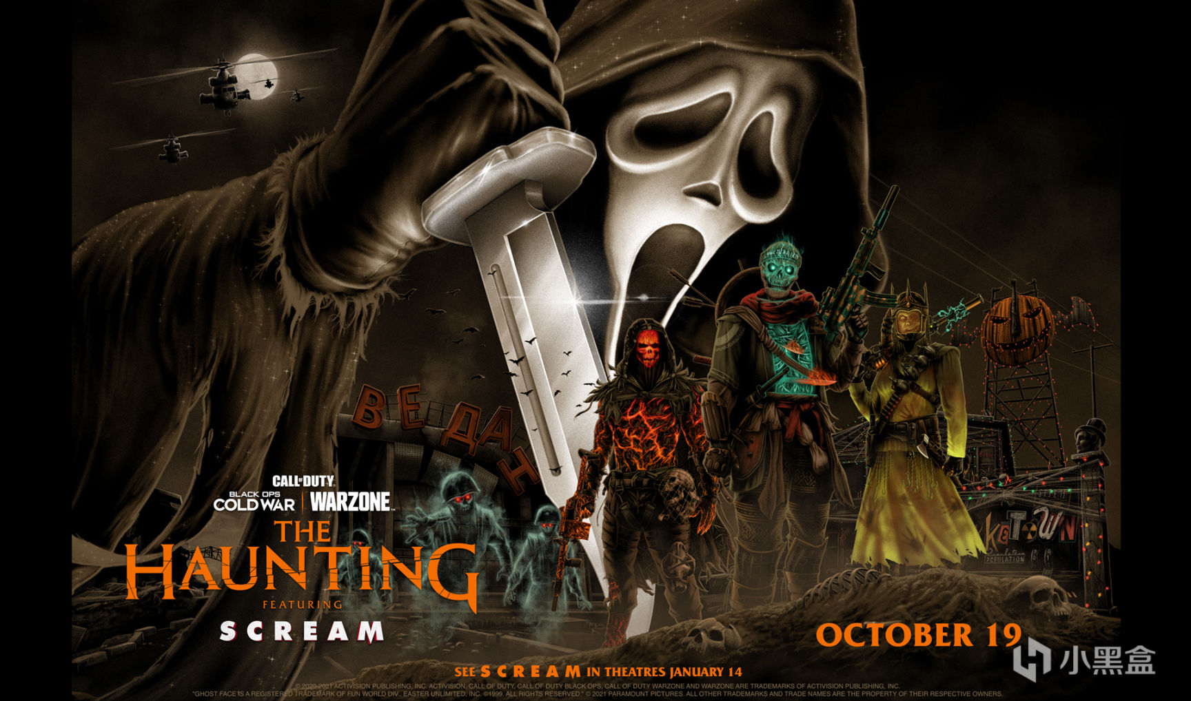 从明天开始,“惊声尖叫 特战兵限时组合包”使你能在鬼脸2022年2月的电影院回归前,就获得在《战区》和《黑色行动冷战》中作为他游玩的机会,派拉蒙和Spyglass Media Group将带回这部经典的电影系列并重新定义90年代恐怖元素。