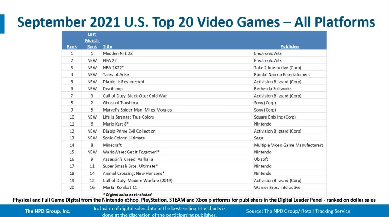 软件方面,EA Sports游戏《Madden NFL 22》登顶,入围的新发售游戏有《FIFA 22》《NBA 2K 22》,《破晓传说》、《暗黑破坏神2:重制版》《死亡循环》等。