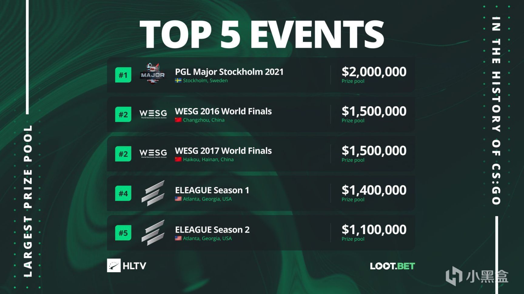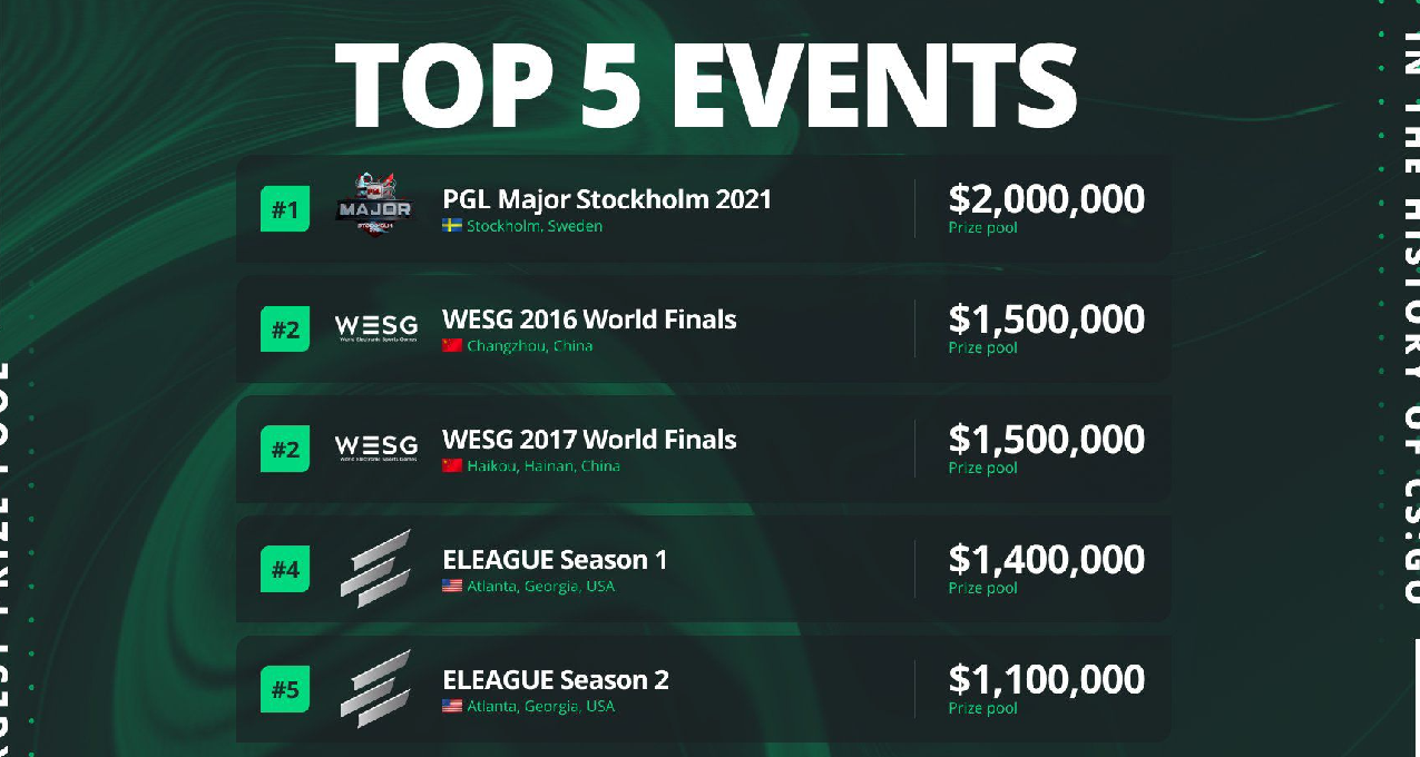 近日,HLTV统计了CSGO历史上奖金排名前五的赛事,其中即将到来的PGL斯德哥尔摩Major以200W美元的奖金池位列第一,而在此之前,在中国举办的WESG全球总决赛以150W美元的奖金分列2、3名,之后便是ELEAGUE第一赛季和第二赛季的110W美元和140W美元。不过除去斯德哥尔摩Major之外,其余两个赛事主办方均因为疫情缘故,已经有一段时间未举办与CSGO相关的赛事了。