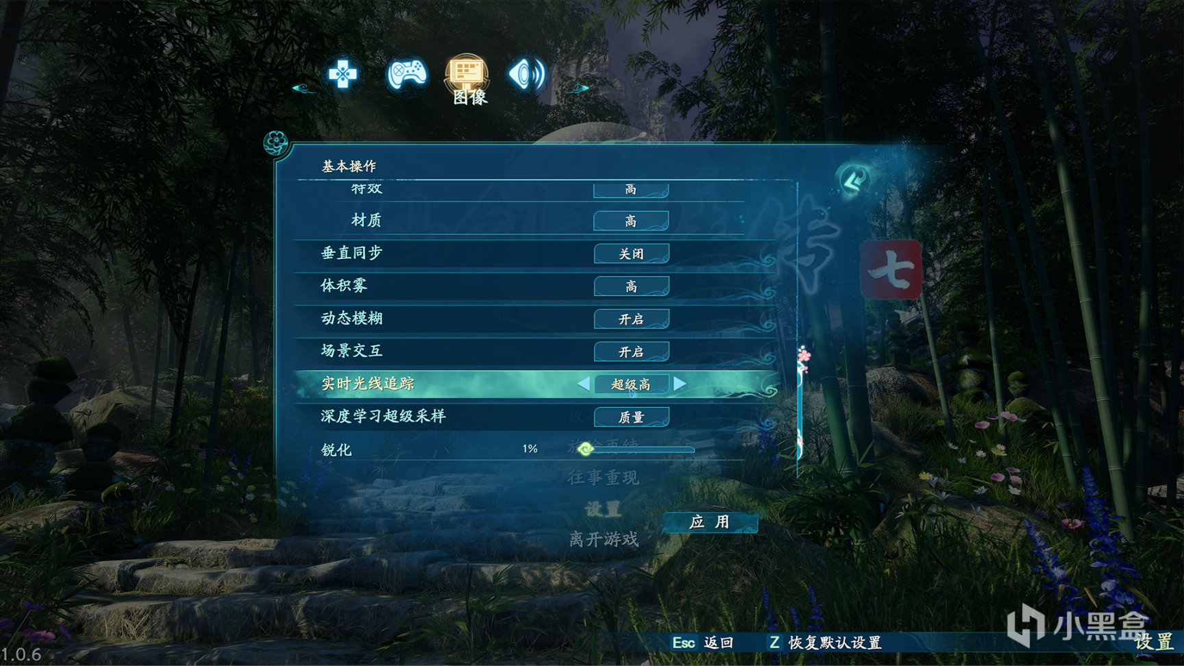 进阶选项最大的卖点是光线追踪和DLSS,这次《仙剑奇侠传7》集成光追反射、光追阴影、光追环境光遮蔽、光追全局照明、光追焦散、光追半透明以及混合渲染模式七大种类,应该是市面上集成度最高的光追游戏没有之一,不过选项只划分了超级高、高、中和低,并没有明确指出具体,至于DLSS也是最新的2.3版本,已经有锐化调节选项。