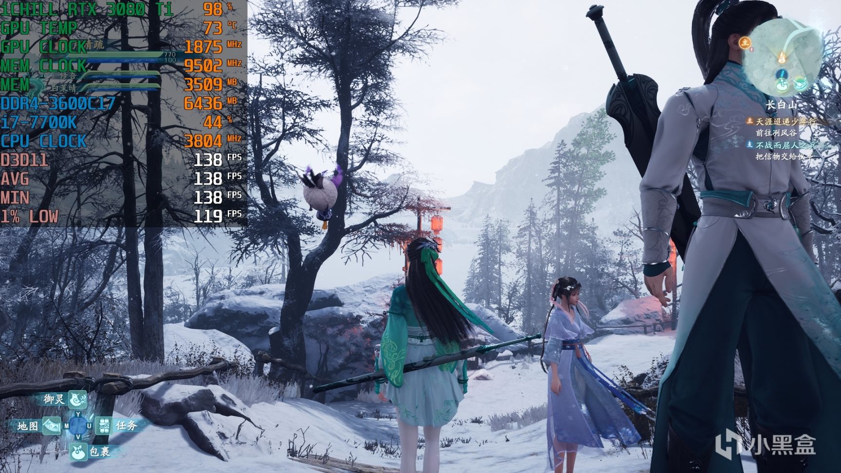 既然《仙剑7》对于显卡性能要求那么高(特指开启光追之后),那么CPU性能要求怎么样呢,结果显而易见,就算是RTX 3080 Ti搭配i7-7700K,在帧数表现上和i9-11900K也是基本没什么差别,就是低U高显这种过渡方案完全是行得通的,这里测试的是预设高画质不开光追,而开启光追之后会更加降低对CPU的性能需求。