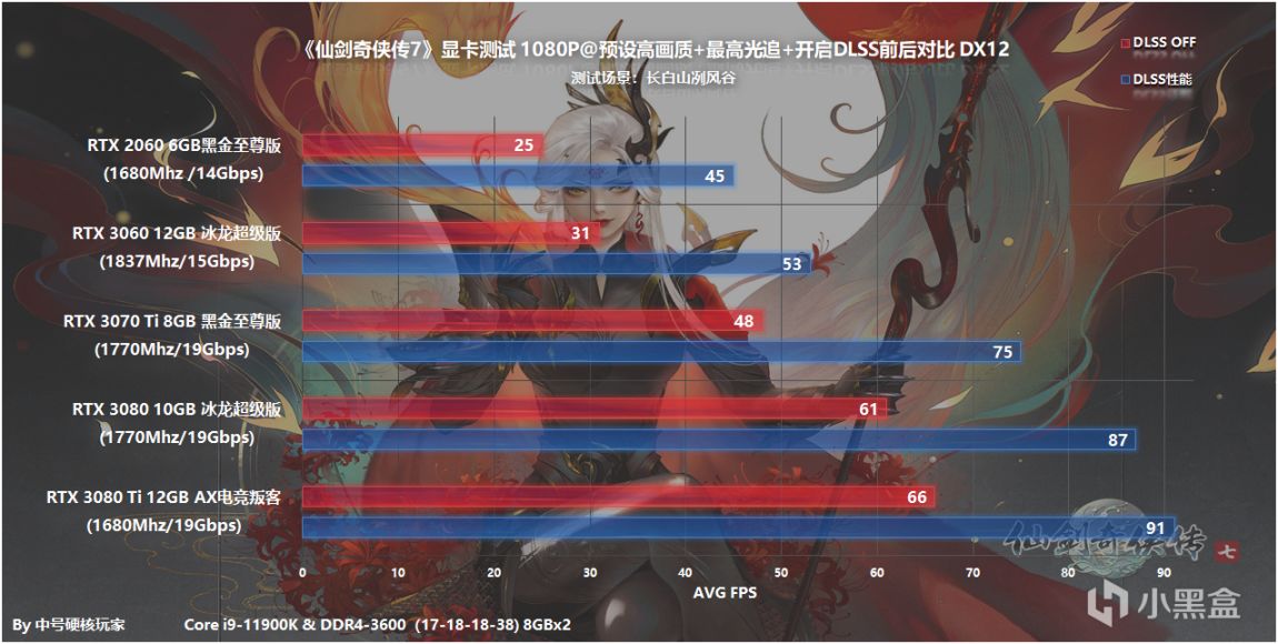 在《仙剑奇侠传7》中,推荐RTX 3060 12GB冰龙超级版,1080P预设高画质+最高光追,开启DLSS性能可以达到平均53fps,算是非常流畅水平,游戏中温度控制在60℃出头,标称Boost频率为1837Mhz,实际会比公版会高一点。