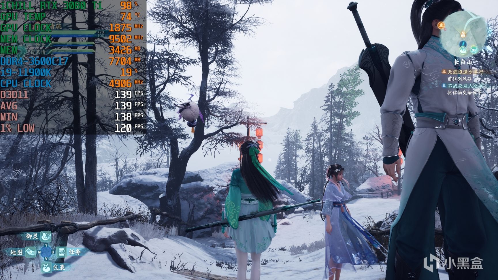《仙剑7》当然就没有内置Benchmark,测试场景选择了前往长白山冽风谷的一段,比起游戏开幕那段村庄场景渲染压力大很多,具体过程就是三个人物角色一起清理两波小怪之后结束,同时也涉及光追相关选项,比较符合玩家现实中的操作,每款显卡需要测试三遍,取中间的值作为最终成绩。