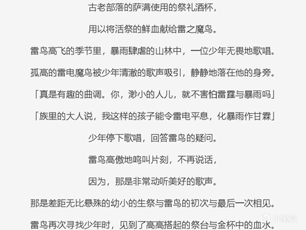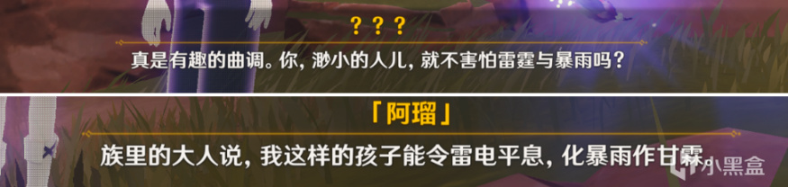 紧接着,雷鸟遇见了阿瑠,它在暴雨之中听见了一位小孩在歌唱,“你,渺小的人儿,就不害怕雷霆与暴雨吗?”雷鸟如是说到。剧情中的这句话,直接复刻了圣遗物故事的原话。