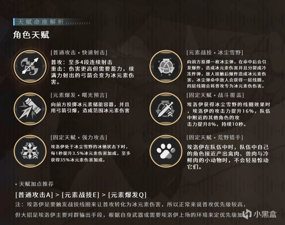 包括常规的普攻四连射,蓄力射击,下落攻击。普攻四连射是埃洛伊的主要输出手段,埃洛伊为冰属性输出角色,在释放E技能堆叠【线圈】达到4层后触发【冰驰】状态持续10秒,埃洛伊的普攻四连射将转化为冰属性攻击。【冰驰】的持续时间内,埃洛伊通常能打出8轮四连射。