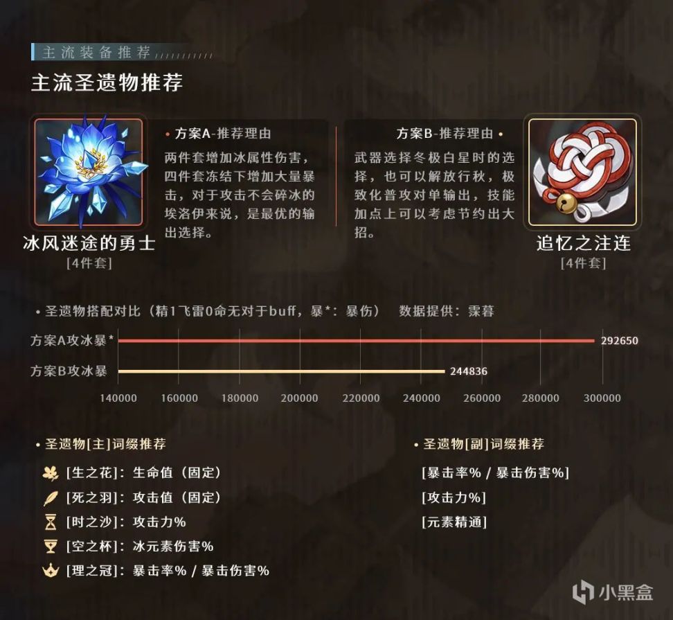 因为埃洛伊作为主C来说,主要依靠普攻进行输出,并且【冰驰】和【强力攻击】提供了很高的冰伤加成,所以追忆之注连4件套的加成效果被比较严重的稀释了。