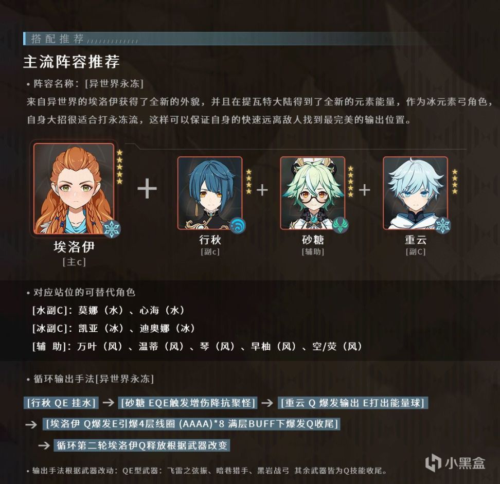 作为冰系附魔主C,永冻流肯定是不可能少的,埃洛伊搭配行秋重云组合,再配上一个砂糖,完美的做到了永冻且不会碎冰的效果,让埃洛伊作为弓角色也有着极高的生存能力。
