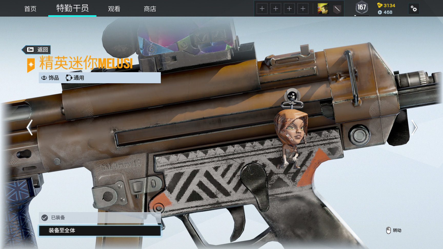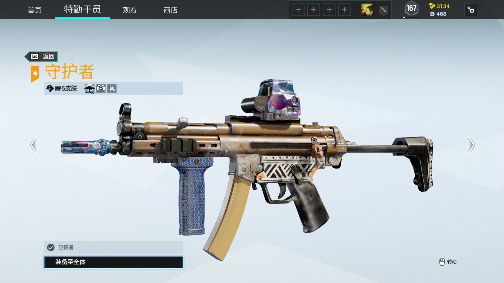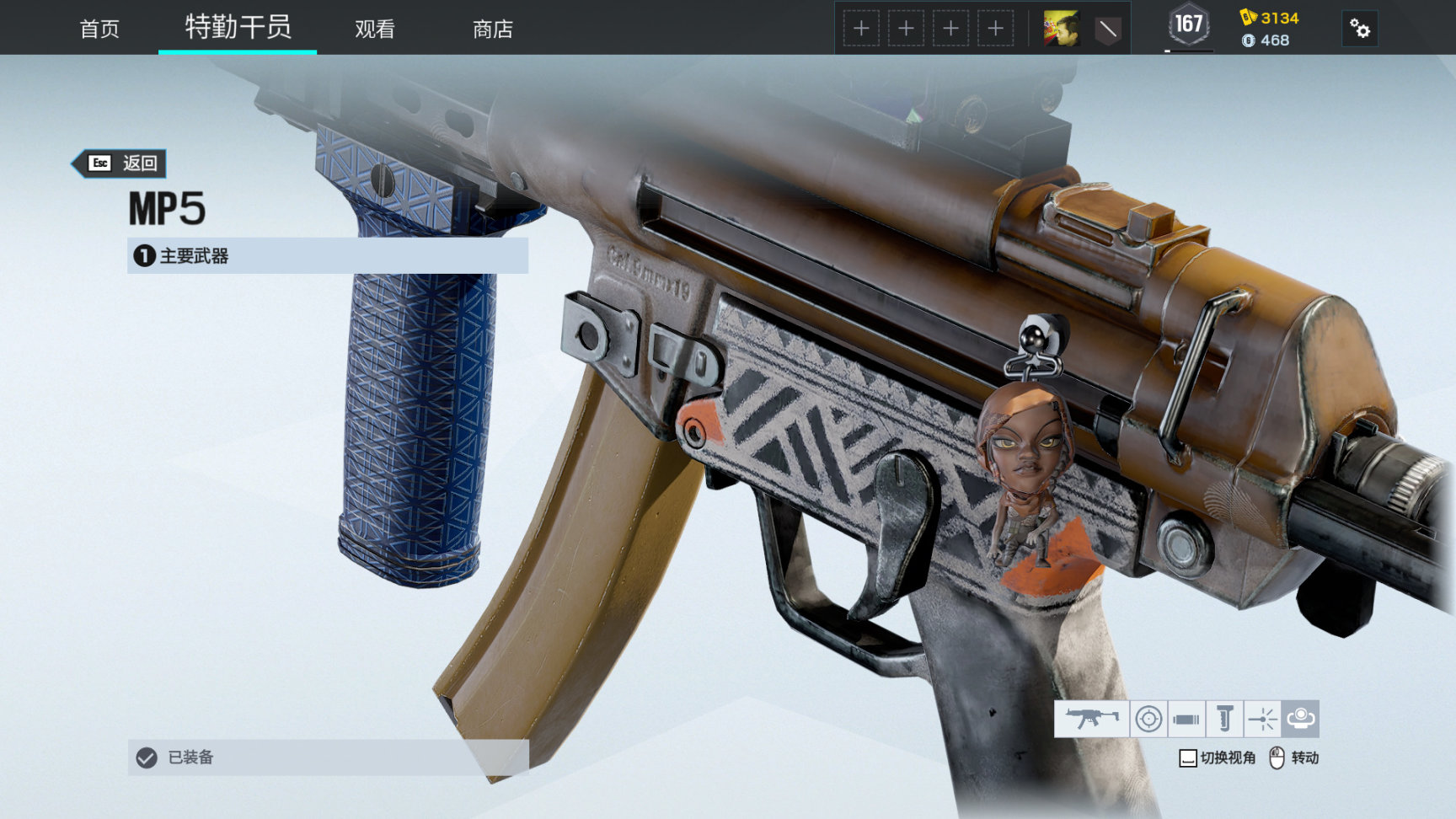 主武器mp5,尘土色渐变金属材质,在握把上方区域有类似粉笔画的抽象图形,有做旧效果。在古代的陶罐器皿常见有此类图形。