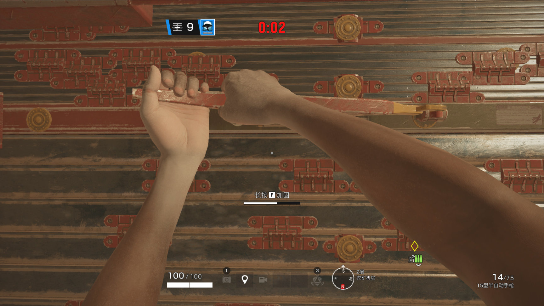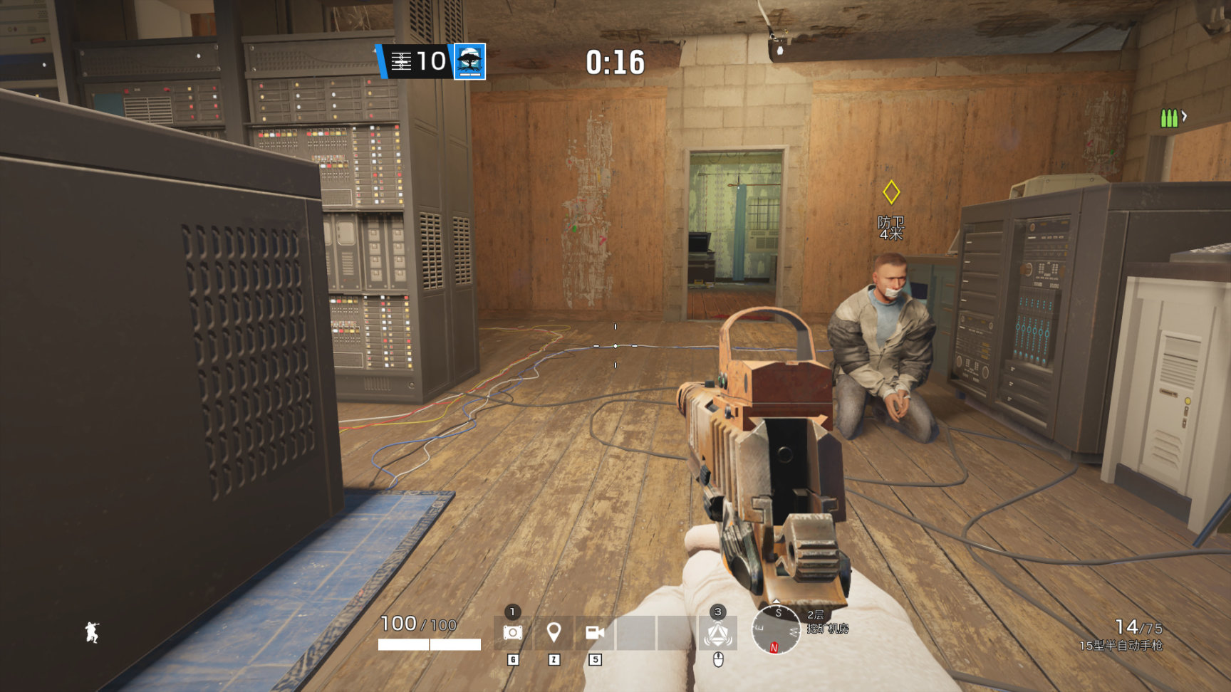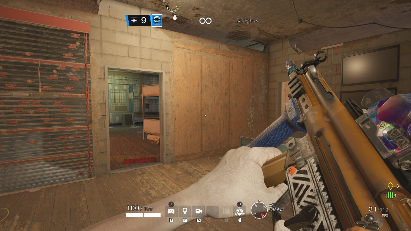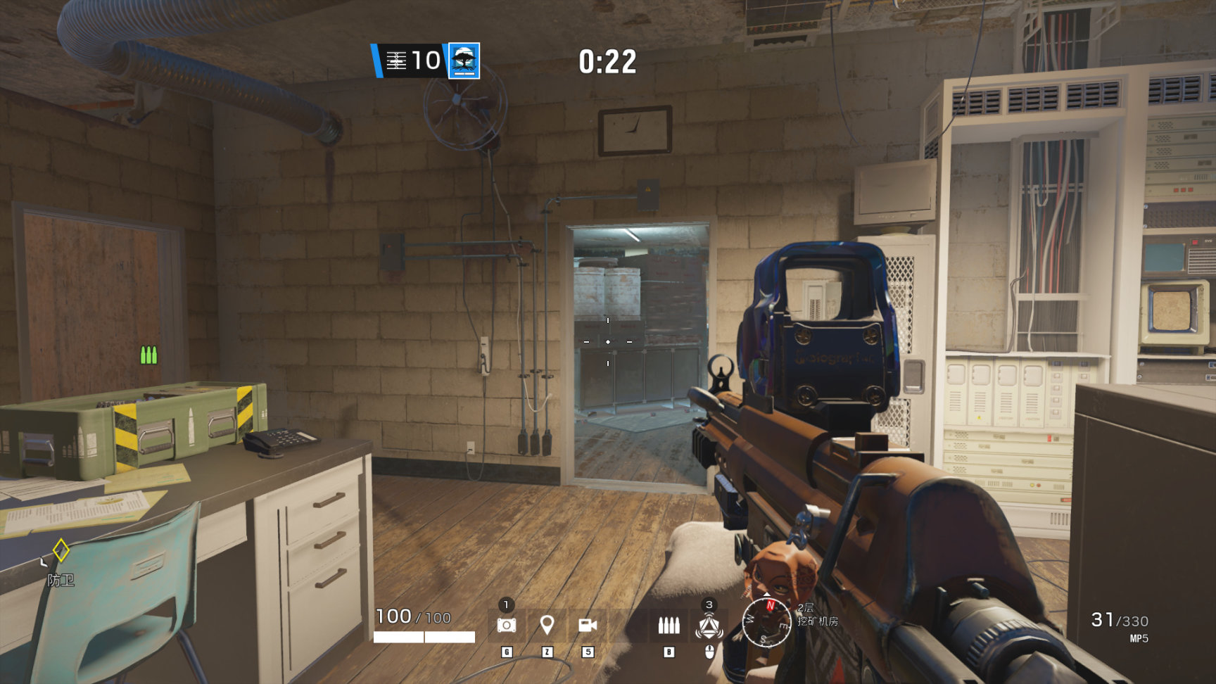 主武器mp5,尘土色渐变金属材质,在握把上方区域有类似粉笔画的抽象图形,有做旧效果。在古代的陶罐器皿常见有此类图形。