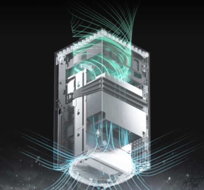xsx采用的是垂直风道设计,主板位置有巨大的真空均热板,顶部有大扇叶的低噪散热风扇,由底部进气,冷气流过机身,被风扇带出,以极小的机身做到了高效又高效的散热。微软凭借高超的工业设计,以及不计成本的钞能力,在xsx上采用像iPhone一样的双层主板,以极高的集成度,做成了比ps5小多了的身躯。xsx运行起来真的是完全没有声音,只有将耳朵贴近顶部风扇区,才能勉强听到低频的风扇声。