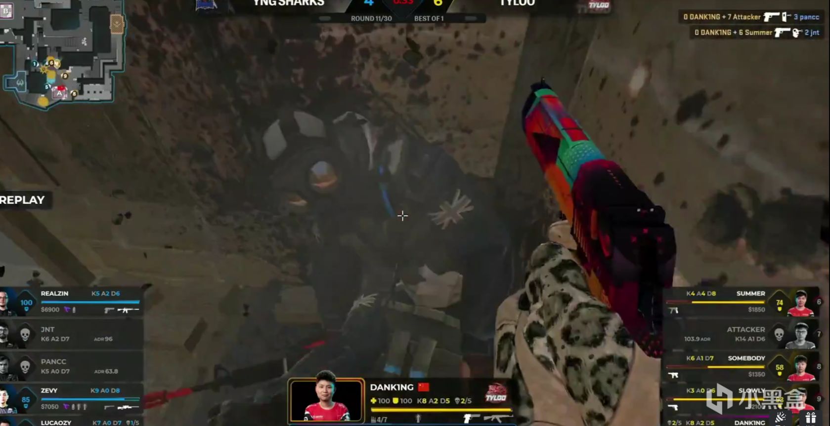 下半场手枪局,Sharks默认一分钟之后选择b区一波流,TYLOO的枪法没有刚住,手枪局被Sharks收入囊中。TYLOO选择强起,Sharks则是最稳健的选择了a区爆弹,DANK1NG沙鹰双杀给到TYLOO一丝翻盘的曙光,不过残局阶段还是枪械优势的Sharks拿下,eco局也是被Sharks轻松收下,比分来到了10-8。下半场首个长枪局,TYLOO集结四人之力强抢中路做到二换三,但是Sharksb区提速,jnt接住了b小回防的somebody,b区沦陷,TYLOO剩余两人直接保枪。TYLOO没有强起,围绕的保下的两把长枪进行次回合的较量,Summer依靠队友的闪光反清a1的同时确定了对方a区爆弹的意图,Sharks硬着头皮a区爆弹,Summer在长箱秦王绕柱走位拿到四杀,TYLOO成功完成翻盘。