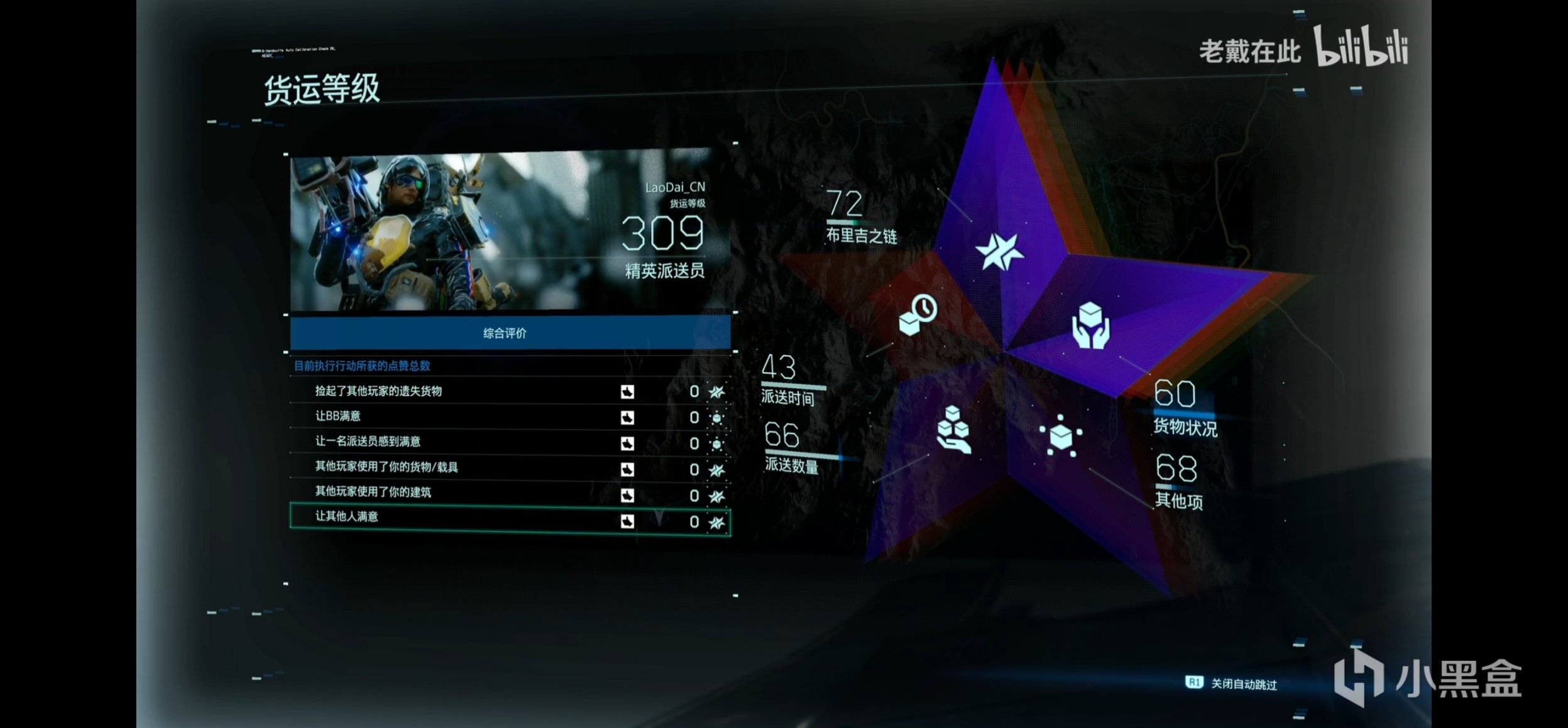 然后就是奖励驱动了,正如我前面所提到的,死亡搁浅将传统游戏的等级机制和经验奖励变成了类似社交媒体的点赞机制。他通过玩家的送货时间、物品完好度等对玩家的任务进行点赞打分,还有玩家铺设道路和建设建筑后与其他玩家异步交互来自其他玩家的点赞。这些点赞代替了传统模式中等级增高和伤害增强带给玩家的满足感,他转化为了玩家得到他人认可的满足感,从而驱动玩家通过异步交互去帮助更多其他的玩家,达到”我为人人,人人为我“的游戏内核。