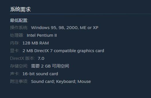 另外,由于这不是重制或复刻版本,而是老游戏的重新发布,因此其支持的系统为Windows 95、98、2000、ME、XP,在新系统上运行有可能会出问题。