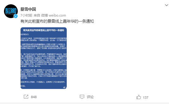 在公告中,暴雪表示他们将会花点时间去重新构想一下暴雪嘉年华的未来,让暴雪嘉年华变成一个让所有人“放心、热情和包容”的活动。他们将会把更多精力放在支持团队推动游戏的开发和优化上。另外,暴雪还称,尽管暴雪嘉年华取消了,他们仍然会持续发布有关游戏的公告和更新。