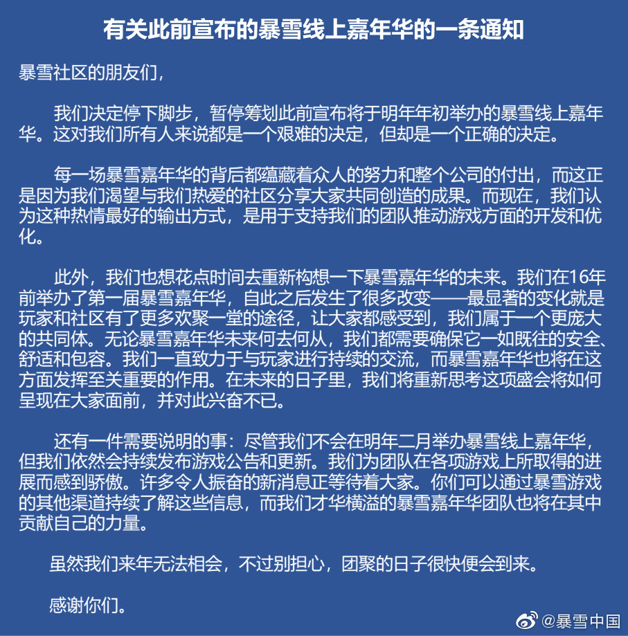 在过去的16年里,暴雪嘉年华都是暴雪最重要的游戏大会,暴雪将会在此展示关于《魔兽争霸》、《守望先锋》、《暗黑破坏神》或是其他IP的新作的消息。然而,鉴于最近围绕动视暴雪的争议、诉讼以及负面新闻,暴雪刚刚宣布原定于明年2月举行的暴雪线上嘉年华活动暂时取消,直至另行通知。