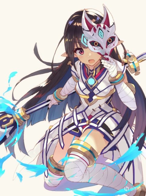 暗属性战锤异刃,后脑带着一个恐怖的狐狸面具,但是外表确实一个娇小可爱的少女形象,浑身缠绕这绷带,像个好奇宝宝一样可爱,一直坚信自己是一个“幸运女神”。