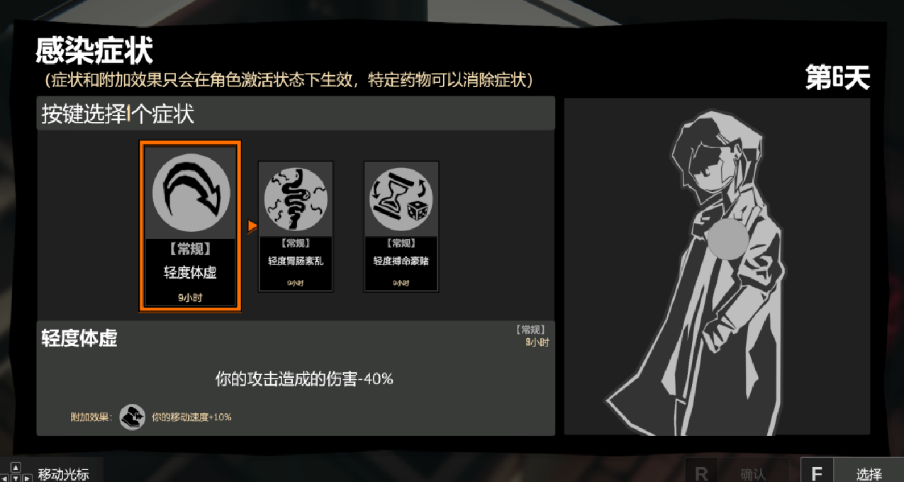 玩家所扮演的母亲由于每天受到病毒侵蚀,在第二天经常会产生不同的症状,会承受一些Debuff和一些随机的增益,而且在晚上不能再工作,否则自己的病情会开始越来越严重。这些系统在游戏的框架下不断暗示着玩家:母亲剩下的时间,不多了。