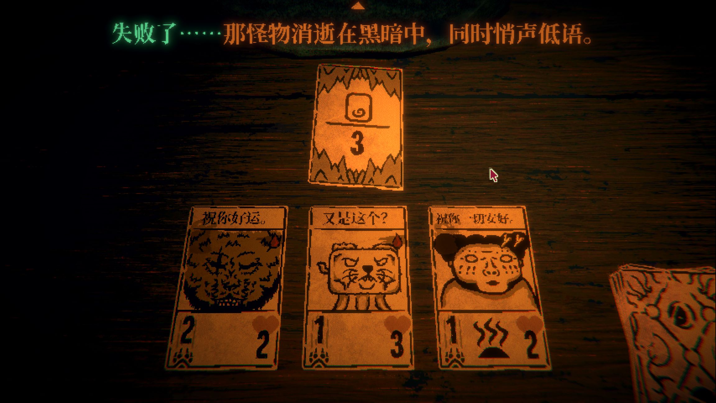 而后续游戏就进入到了卡牌游戏的内容之中,而在这里meta也开始显现。出现了一张喜欢逼逼叨的卡牌,它会点评玩家的操作会嫌弃玩家的操作。而到了游戏的中途,它会开始引导玩家来到这个场棋牌游戏的外面,去房间之中进行探索。然后碰到其他有着自主意识的卡牌,而在这其中它们会聊一些玩家暂时听不懂的东西。而这个引导玩家的探索和交流都是在告诉玩家一个点,这场游戏并不只限于这牌桌之上,桌上桌外都是这游戏的一部分。