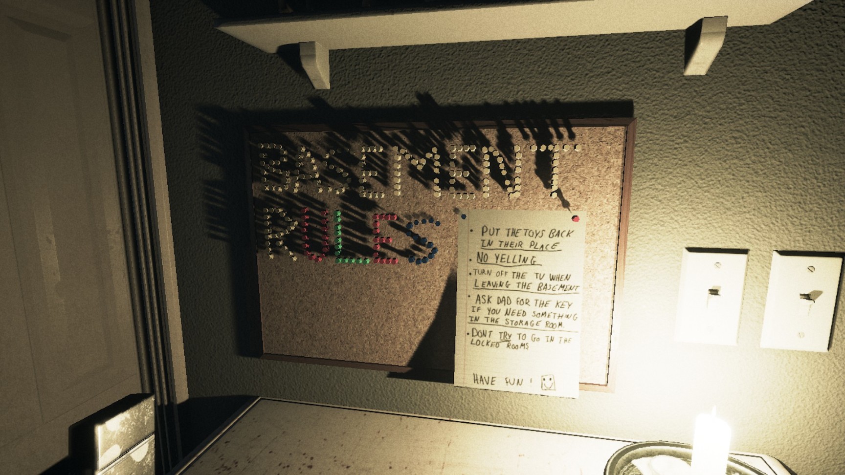 “面容”里比较有意思的是san值机制,当玩家处于黑暗环境/遇到“普通的”超自然现象(灯关闭,收音机自己打开)时,精神状况会下降。下降到一定程度时怪会出现秒杀主角。因此及时赶到有亮光处在自由探索时非常重要,玩家可以通过更换灯泡和点燃蜡烛给房子里增加光源。必要时也可以服用药片,不过我建议把药片尽量省着,游戏中后期的某些场景下会非常依赖药片。