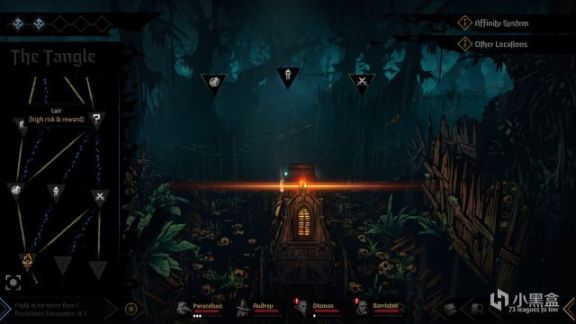 队伍集结完毕以后就可以坐上马车开始我们的冒险旅程了,相对于一代游戏马车只是剧情走了个过场,在2代中“开车”将会伴随游戏的全程,虽然这个开车过程事实上产生的意义有限(部分场景压过去会掉san,部分会几率获得道具)。我们可以在上图左侧看到:类似于杀戮尖塔,《暗黑地牢2》同样是由约3纵列构成的交错路线,其中包含了战斗、难民、商人、医院和随机事件等环节要素。