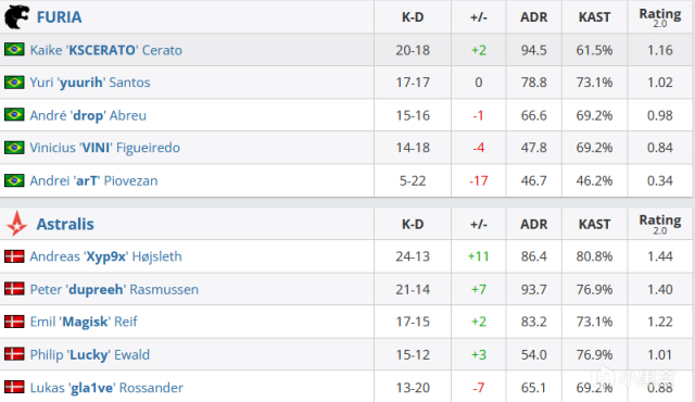 手枪局丹麦人直接非常规冲下中路,将巴西人打了个措手不及,1-0。黑豹ECO后起出长枪,却被Xyp9x的吹风机三杀抬走,3-0。第五回合,FURIA继续快攻A1,双方各自TK后,FURIA在A区埋下雷包,2打3下,drop站在包点与大坑的yuurih形成交叉火力,成功拿下第一分,4-1。然而次局FURIA的B区rush再度被丹麦人的道具教育,5-1。ECO局里,巴西人继续进攻A区,虽然Lucky还活在大坑,但包点已经沦陷,埋下雷包后,gla1ve先被drop打掉,大坑的Lukcy拉出也被KSCERATO吹掉,连接的Xyp9x被双拉直接打掉,5-2。再度起出长枪后,丹麦人的道具与地图控制仍在教育着巴西人,Astralis一鼓作气将比分扩大到10-3。好在半场结束前,yurrih与VINI轮流发挥配合Lucky的空枪追回两分,半场比分10-5。半场互换后Astralis进攻中路被巴西人打光,10-6。丹麦人ECO后起出长枪,gla1ve抓timing直接冲进空防的B区,5打5埋下雷包,11-7。次局巴西人的大小坑站位也没能顶住Astralis的A区进攻,12-7。第二十回合,gla1ve直接匪口烟里混死香蕉道压出的arT,4打5下,A1凉亭下的KESCRATO大狙三杀,12-8。次局丹麦人进攻侧道被yurrih三杀,剩余两人抱团进攻B区险些完成残局,好在KESCRATO站出来打赢1v1,12-9。暂停后丹麦人call战术,大坑一线烟成功占领包点后打赢阵地战,13-10。第二十四回合,Astralis进攻B区,被drop与KESCRATO各打一个后,还是顽强的拿下包点,Xyp9x三杀后来到与VINI的博弈,双方心理博弈后还是选择都在B区,最后VINI打侧身枪法失误被Xyp9x反杀,14-10。第二十六回合,艺术哥前顶被Lucky接住,4打5下,KSCERATO大狙双杀补回人数,drop沙鹰也拿到击杀,可4打2下,dupreeh与魔男各自双杀拿下残局,16-10,Astralis拿下首胜!