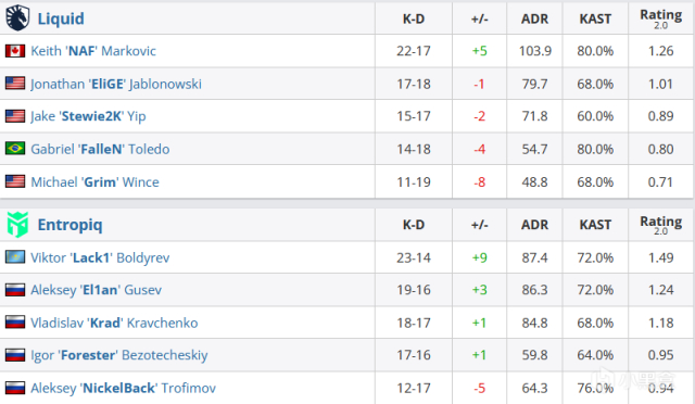 CT方开局的液体凭借EliGE与2K双人五杀拿下手枪局,1-0。随后鸡哥强起局三杀,3-0。来到长枪局,NickelBack在人数劣势下三杀帮助Entropiq拿下第一分,3-1。次局Grim烧死Lack1打掉NickelBack后,补枪的Forester也被NAF打掉,Entropiq直接保枪。然而次局El1an保下的大狙发力,三杀帮助Entropiq成功翻盘。第八回合,Lack1四杀帮助Entropiq拿下关键局。之后比赛被Entropiq彻底统治,Lack1与El1an如同两把镰刀不断收割着各个点位的北美人。上半场最后一回合,Grim与EliGE发挥终于打赢3v3回防,半场比分6-9。半场互换后,鸡哥再度双杀帮助液体拿下手枪局,液体顺势追平比分,9-9。然而来到长枪局后,液体这种偏向于枪法的进攻在独联体枪男面前根本不够看,北美人在枪法上完全被处决,道具也随着比分的落后逐渐稀碎,Entropiq用一波7-0的防守将液体彻底击溃,16-9,Entropiq爆出传奇组第一个冷门!