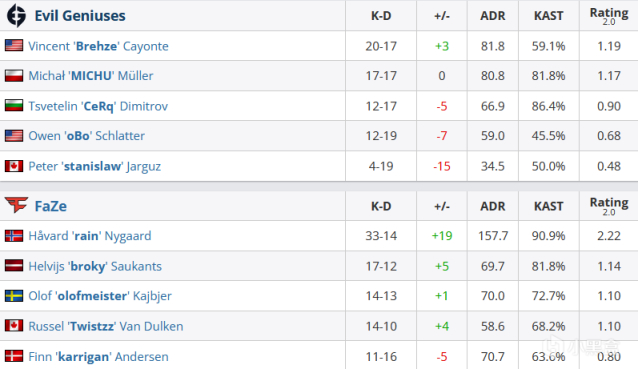 手枪局EG进攻B区被银河战舰直接全部撞死在B洞外,1-0。次局EG强起抱团进攻A小,Brehze先是一发带走broky帮助队友破点成功,随后又在1v2残局中两发两个头拿下残局,1-1。然而再度来到长枪局,Twistzz与rain直接用双人五杀粉碎了EG的进攻,2-3。随后rain的双杀再度将EG的A小进攻停滞,而之后的ECO局里奥拉夫与Twistzz的双人五杀则彻底激活了挪威雨神。rain先是在之后的长枪局里三杀帮助FaZe拿下关键局后,又是再下一个长枪局里化身战神四杀再度粉碎北美人。关键词,沙二、rain、北美队伍!之后两回合rain再进账五个人头,FaZe已经9-3领先。第十三回合, 沉寂已久的Brehze站出来三杀帮助EG拿下第四分,9-4。次局Brehze再秒karrigan帮助EG顺利进入包点埋下雷包,然而rain与broky各自双杀,FaZe惊险回防成功,10-4,好在半场结束前EG还是将比分追至10-5。来到进攻方后,经典p250配雨神,双杀配合Twistzz的双杀再度拿下手枪局,随后在rain与总监的无限火力覆盖下,银河战舰在沙二降下暴雨,挪威雨神爆砍33-14,2.22rating的炸鱼数据,FaZe轻松以16-6战胜经验宝宝EG拿下首胜!