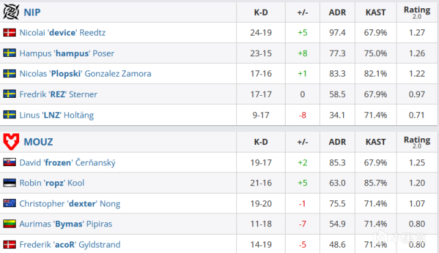 手枪局acoR三杀拿下,1-0。次局NIP强起,CZ+鸟狙的组合瞬间翻盘,1-1。之后frozen与Bymas虽然沙鹰各抽一个,但是REZ吹风机四杀力挽狂澜拒绝被翻,1-2。device起出大狙后,NIP宣布接管比赛,REZ、hampus、Plopski、LNZ四架马车带着device的大狙化身坦克一鼓作气将比分扩大到9-2。第十二回合,MOUZ终于跌跌撞撞进入包点,埋下雷包后,ropz双杀拿下残局,10-3。然而次局hampus与device的双狙轻松粉碎MOUZ的进攻,10-3。之后MOUZ的进攻再无进展,半场比分12-3。半场互换后,dexter与frozen各打两个帮助MOUZ拿下手枪局,12-4。次局frozen吹风机四杀粉碎NIP的强起局,MOUZ将比分追至12-6。第十九回合,frozen双杀配合dexter吹风机一换一,MOUZ建立4打2优势,埋下雷包后,ropz与acoR各打一个完成回防,12-7。次局继续起枪的NIP被dexter拿下三杀,12-8。第二十二回合,hampus率先打掉acoR,4打5下赌区错误的MOUZ果断放弃回防,13-9。次局frozen四杀再度粉碎NIP的进攻,13-10。之后dexter与ropz各自双杀再追一分,13-11。次局NIP却用一波半起RUSH拿下久违的一分,14-11。然而之后dexter与ropz又各自双杀打了回来,14-12。第二十七回合,NIP用一波B区爆弹终于得分,15-12。次局NIP在4打5下强攻B区成功,终于拿下首胜,16-12。