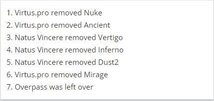 连续丢分的vp进攻节奏有些混乱,想重控中路与A大却又被B1T和s1mple双人三杀给震住,只能够进行长时间的保枪。随后混起的vp决定默认过后进行B区进攻,结果他们的默认不到位以及单摸的B1T抓到了buster走下水道回B的信息,让navi直接回到四人重B的站位,利用架枪轻松粉碎了vp的进攻。上半场最后一回合,vp的进攻节奏稀碎,各自摸盘被navi众人轻松架死,11-4。