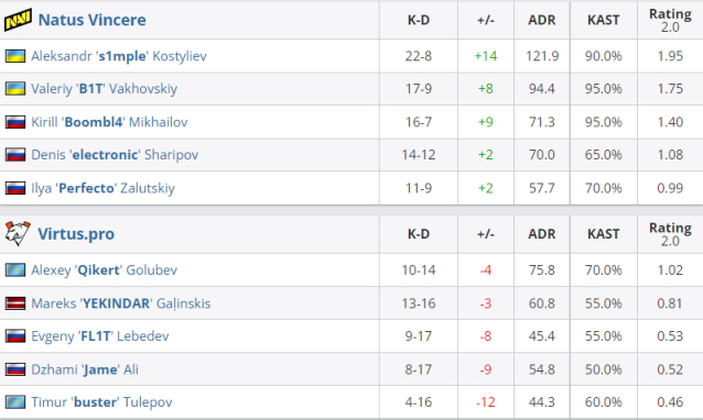 来到下半场第一个长枪局,拿到大狙的Jame于长管外拿到首杀后将navi劝退到了A区。而Boombl4在侦察到A区难攻后,全队立刻掉头从下水道来到工地,爆出一波道具后利用超高的突破质量迅速粉碎了B区防守,而后架枪分配清晰拿下守包残局,赛点到手。第二十回合,navi于进攻A大时补枪出现了失误,导致FL1T拿到双杀。随后在时间不足的情况下,electronic和Perfecto毅然决然从下水道转往B区利用双人跳拉的方式打死直架的buster。下包阶段,Perfecto想占领前点却被Qikert击杀,只剩下残血的electronic面对1V2残局。他先架住了二楼同样大残的Qikert,随后利用YEKINDAR来到包点的时间差及时地换了位置,并在最后读秒大拉杀死了想要十秒真拆的狂哥,1滴血打赢了这个残局,助队以16-4碾压了vp。