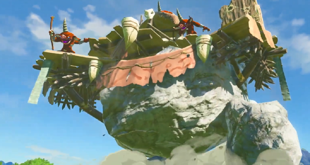 预告片中还出现了前所未见的怪物,这个东西显然是某种文明的产物。(腰部有一个明显的花纹,这个东西不可能和石头人一样是“天生天长”的)但是并不是守护者那样的海拉鲁文明。从它背后露出的白色建筑物来看,这个东西十有八九是天空之城上的,和守护者职能类似的怪物。