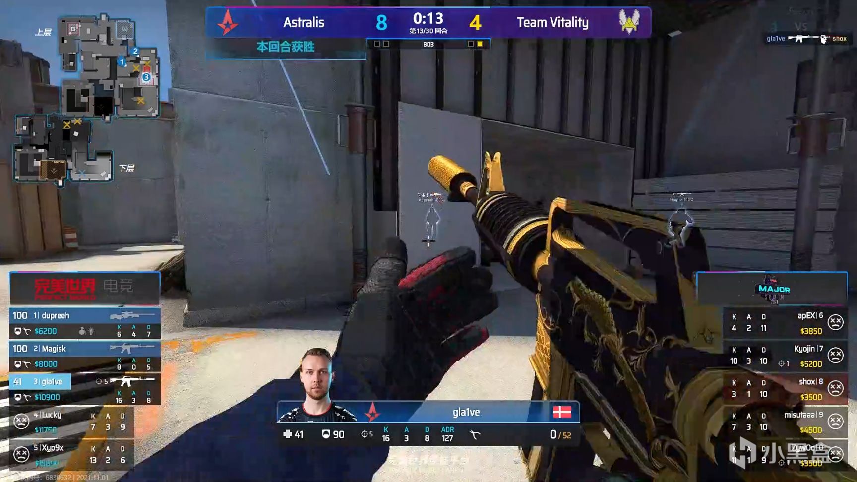 第8局,A坡控制还是重点,Xyp9x双杀,A队一换三,多打少轻松拿下残局,eco后比分来到5-4,A队反超了比分。Vitality A坡控不住,准备第二时间再打,但A队烟雾弹太多,A坡强上时只剩40秒,A队早已把B区和中路摸空,赌了4A,将Vitality全部接住,下局ZywOo的英雄ak虽然击杀了gla1ve,但多人枪械劣势还是输掉了残局,7-4。再一次来到长枪局,gla1ve A坡混烟前顶双杀,Kyojin中路秒掉Lucky,Vitality直接夹A,回防的gla1ve又一次站了出来,先打中路再打正面,拿下了Ace,eco后比分来到9-4。第14局,gla1ve和Xyp9x在A坡拿到了一换二,Vitality静摸B坡,Kyojin双杀破点,A队剩余两人全部回B,Vitality转A区下包,Xyp9x混烟没有敢强拆,被ZywOo拖够了时间,9-5。上半场最后一局,双方中路二换二,Vitality转B坡,但Magisk就像个炮台,将正面三名土匪全部击杀,上半场A队10-5领先。