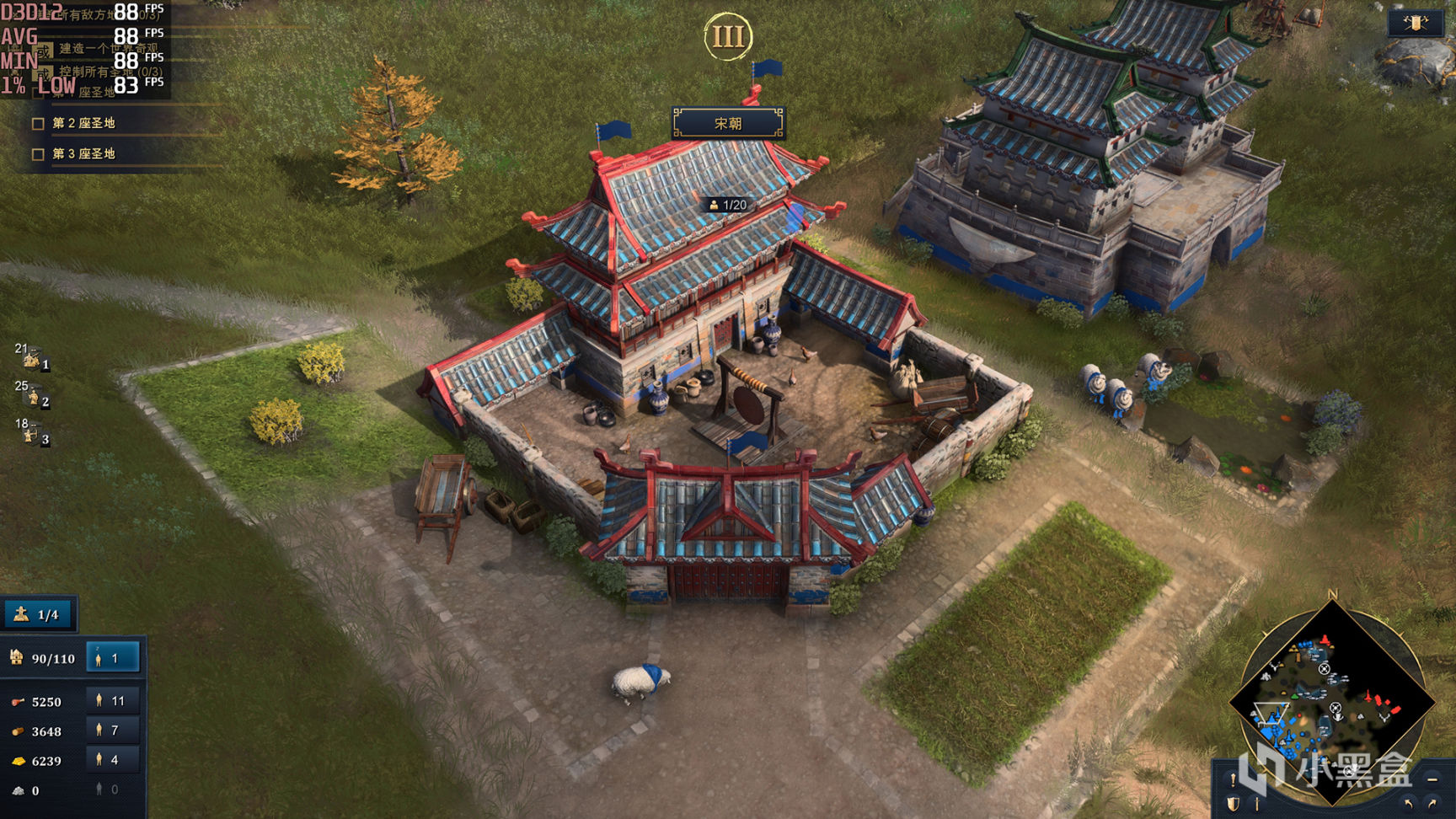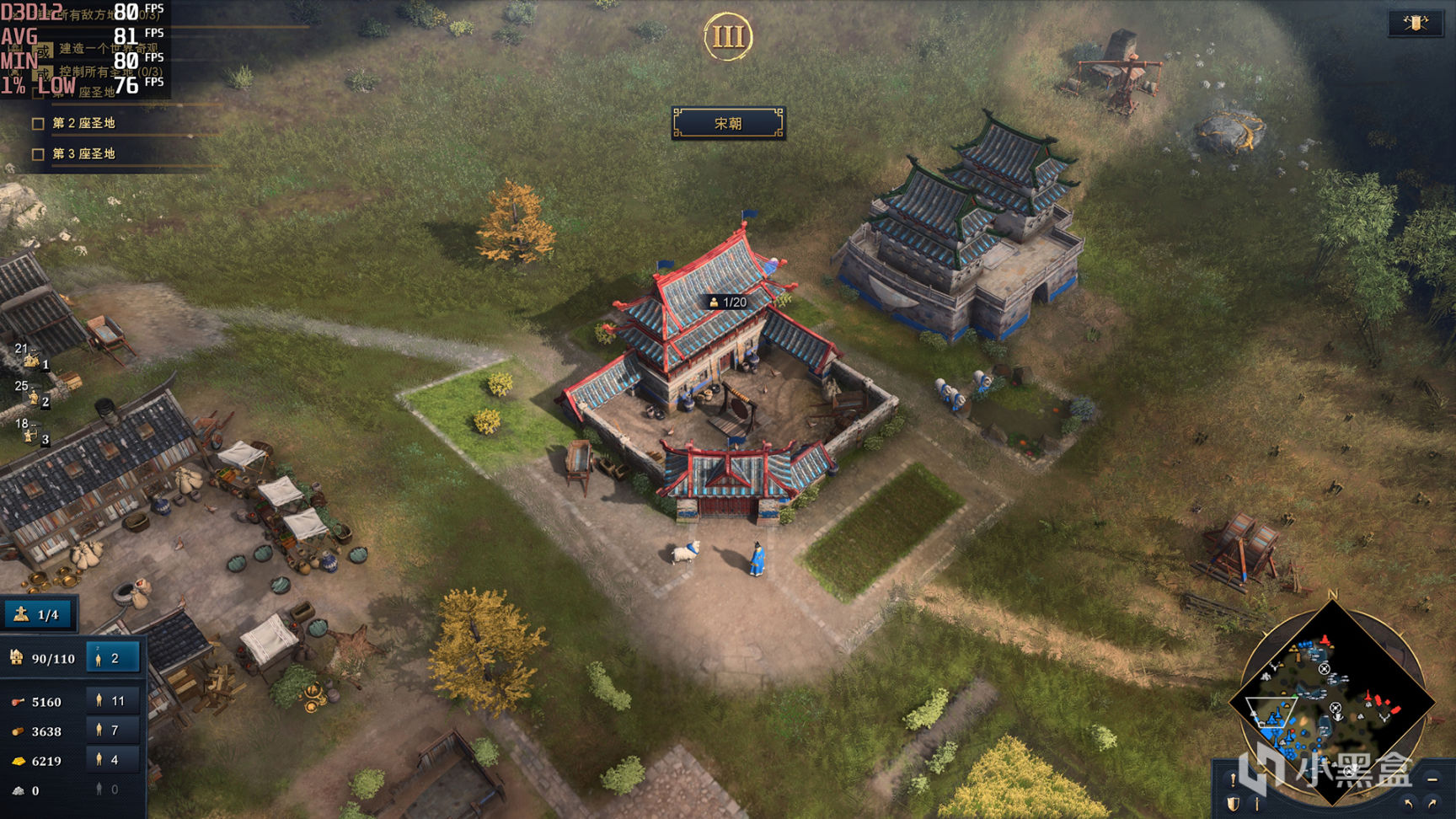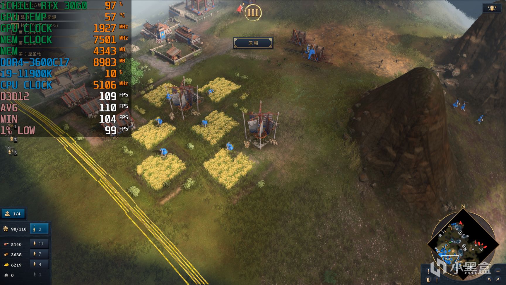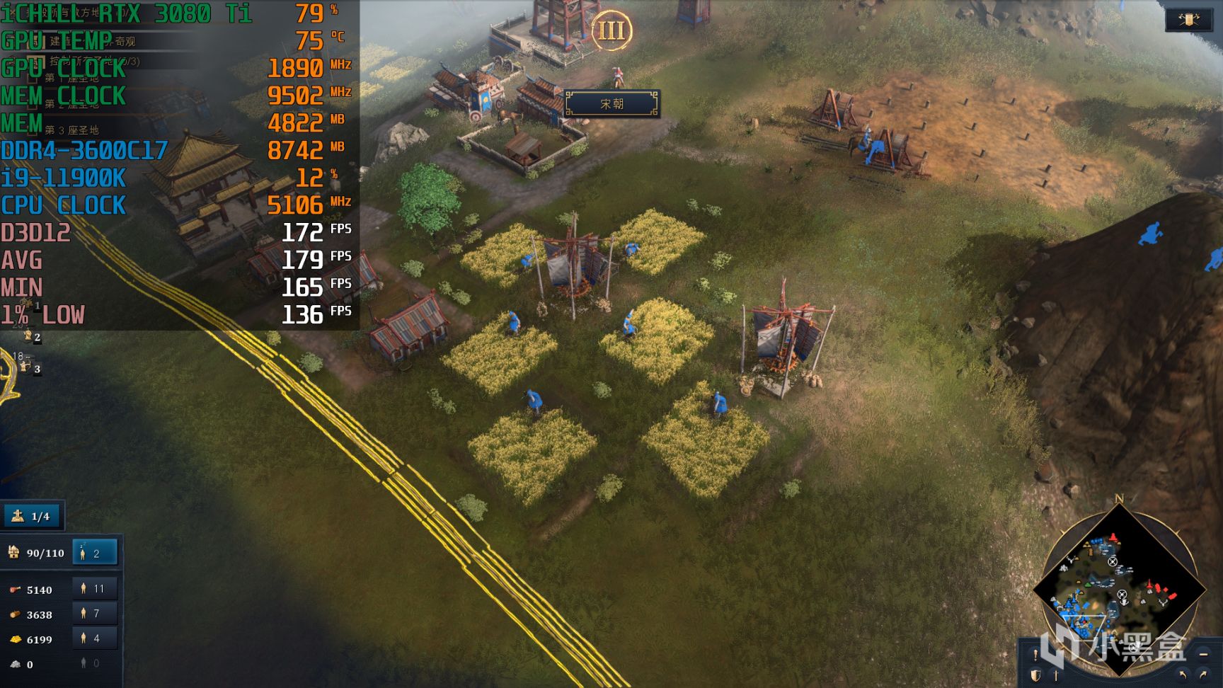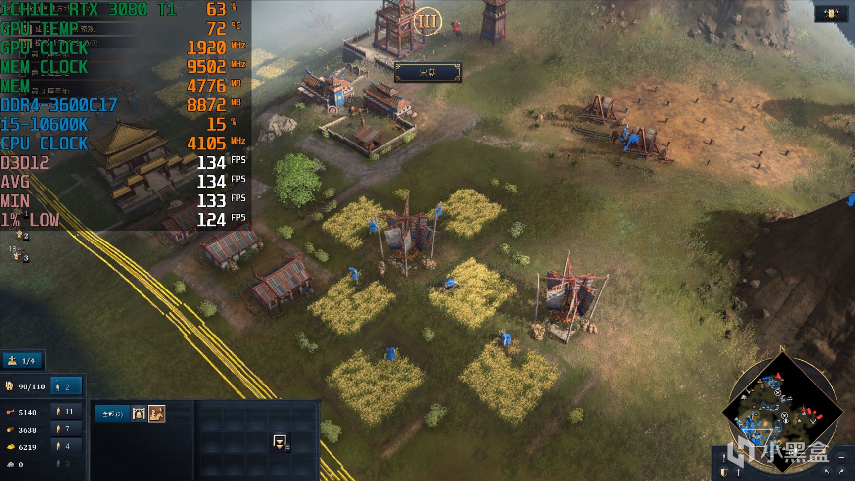 游戏没有内置Benchmark是没有完全想到的,毕竟是微软这样的巨头公司出品,不过确实游戏测试帧数比较麻烦,因为场景跨度很大,单位规模最大可以达到200这样的极端情况,这里就简单选择连贯两个场景作为测试项目,首先就选择了中国,在整个建筑群中移动视角,代表着日常操作,之后点小地图选择部队进攻对方这样一个过程,渲染压力肯定不是最大但也有一定的参考性。