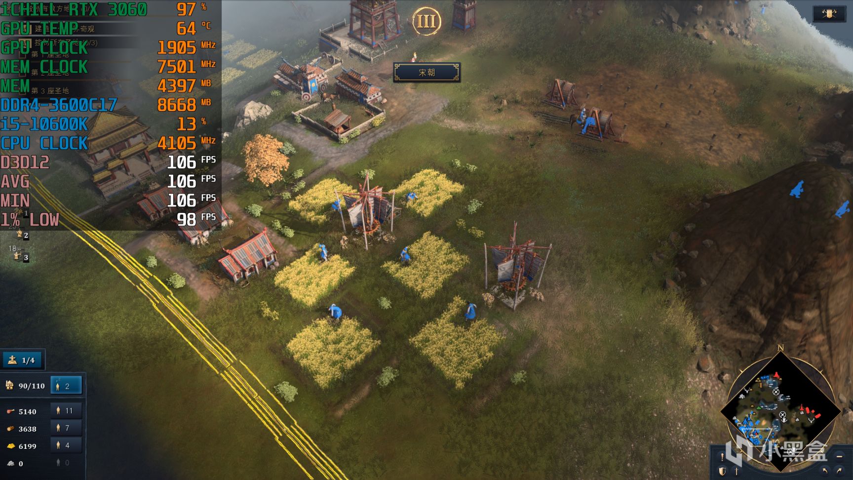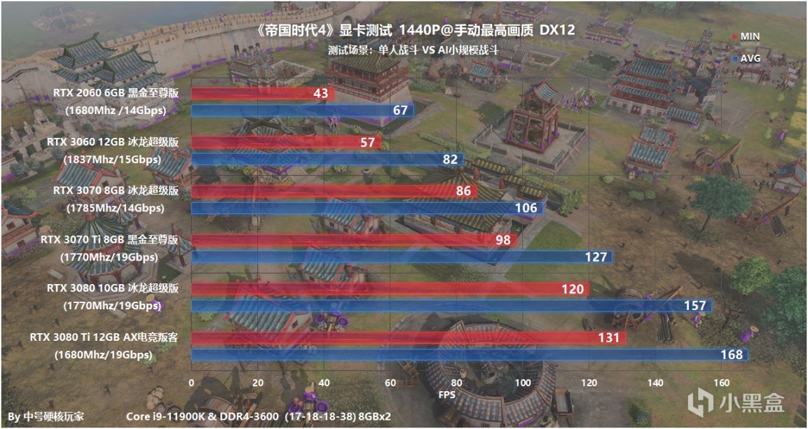 在《帝国时代4》中,推荐RTX 3060 12GB冰龙超级版,2K手动最高画质,遭遇战平均帧率可以达到82fps,属于非常流畅的水准,游戏中温度控制在60℃出头,标称Boost频率为1837Mhz,实际会比公版会高一点。
