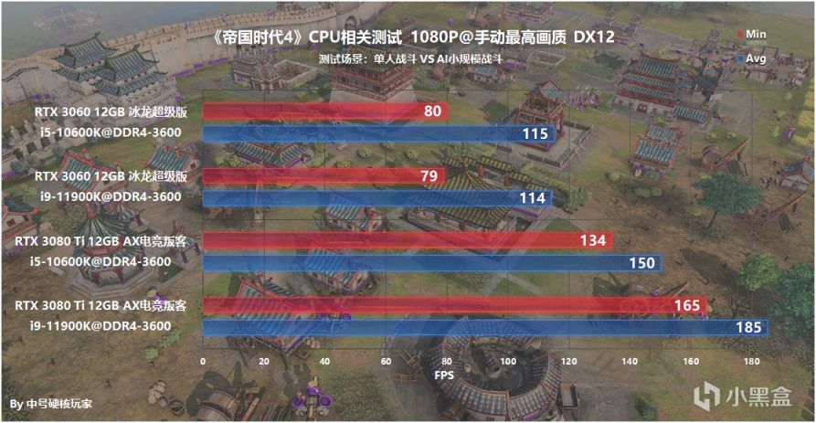 CPU测试也使用i9-11900K关闭核心和调整频率来模拟,六核十二线程的规格性能相当于超频之后的i5-10600K(因为这次测试RTS游戏,所以门槛提高一点),内存频率也是搭配的DDR4-3600频率测试的,还有就是按照正常状态的i9-11900K来测试,并且搭配RTX 3080 Ti和RTX 3060两款显卡两种情况,这样就可以看出差异性。