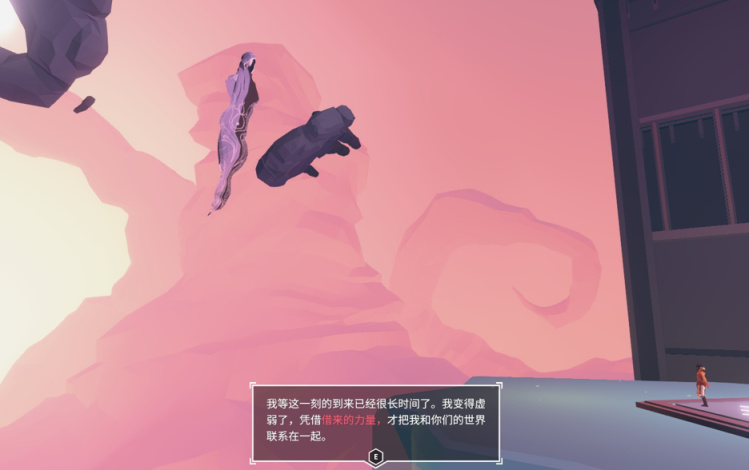 而这几座岛屿便是游戏的核心,我们所控制的主角叫做“奥克”是一名朝圣者更是一名人类与动物达成契约的“耳语者”。他拥有飞鸟一般的能力可以在这个破碎的岛屿中自由的穿梭,游戏里的云看起来像是一坨坨的白雾但是当你穿越它时画面与印象也变得不同寻常起来。