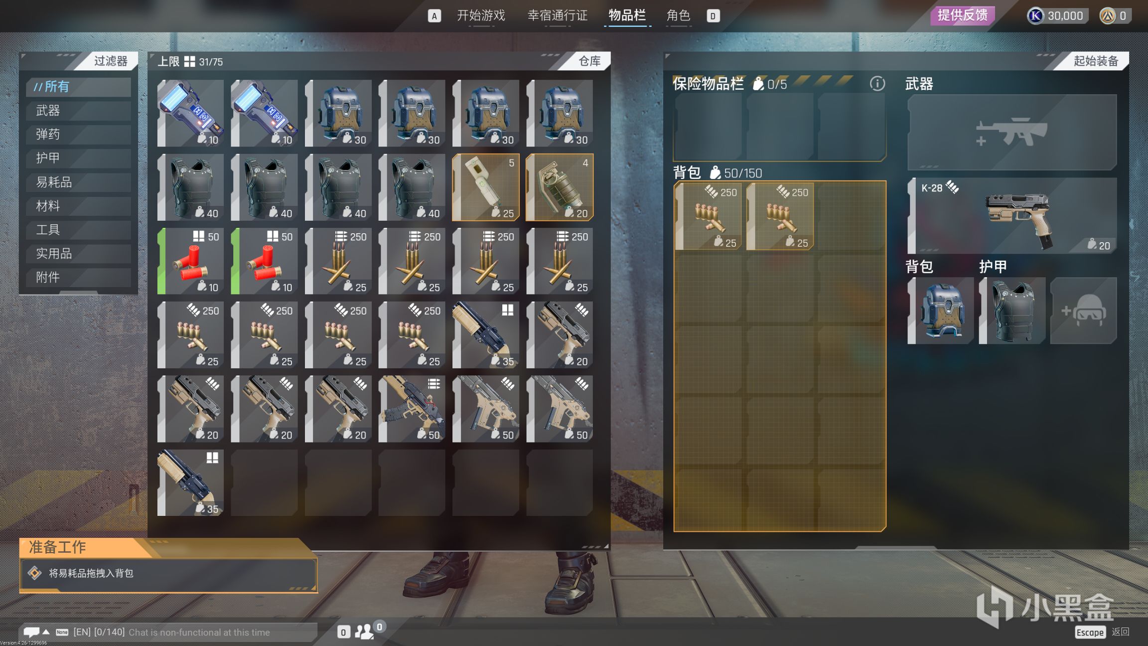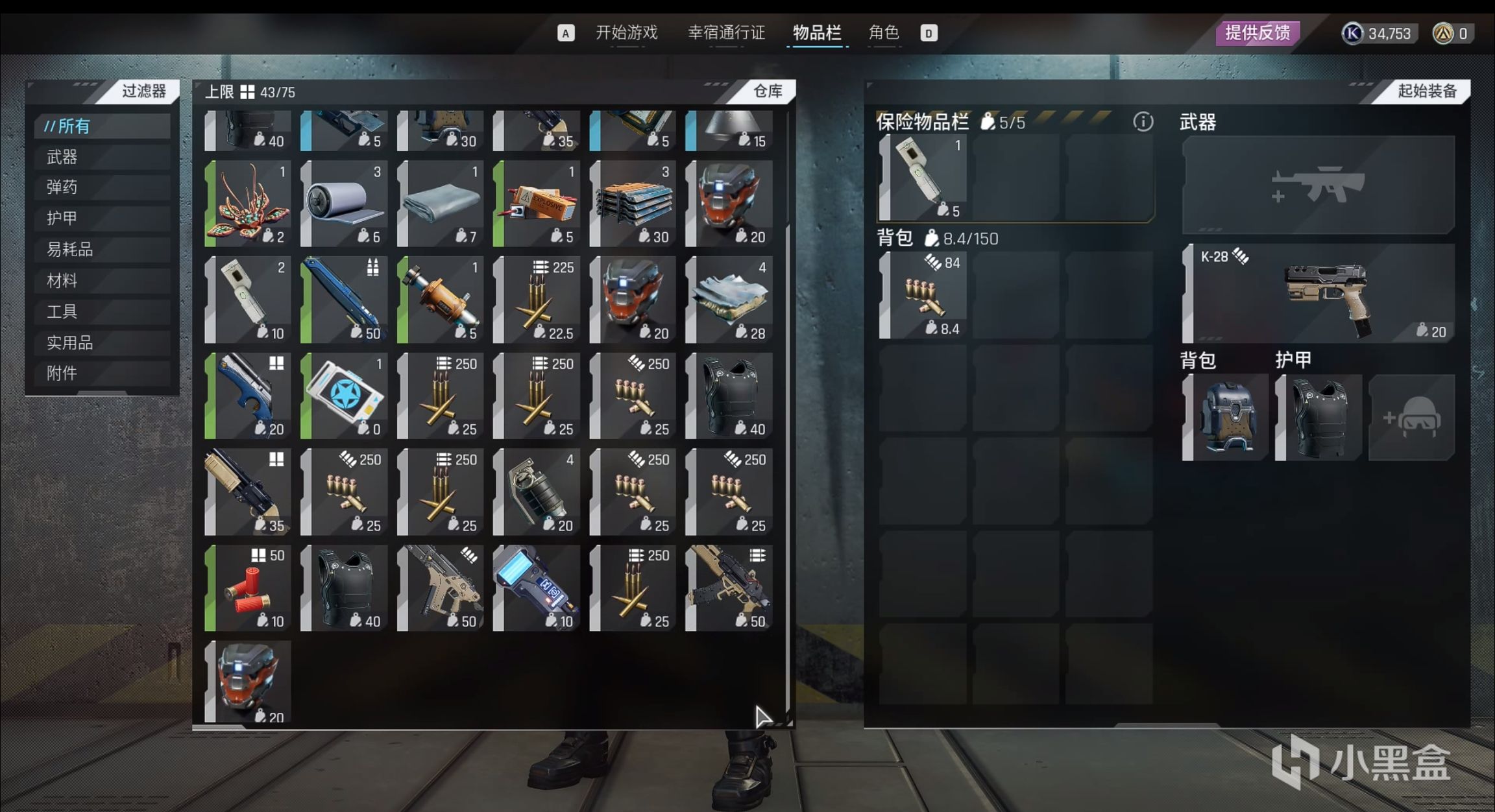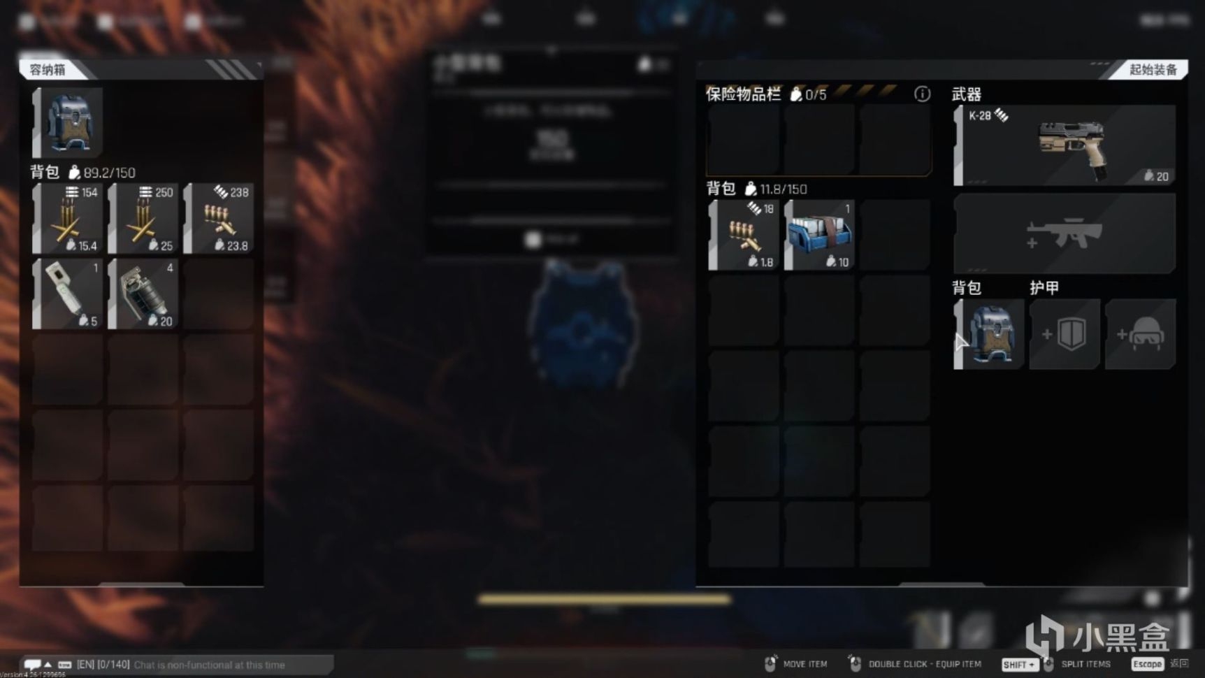 ①装备主要分为头盔、护甲、背包、武器、弹药以及消耗品,不要把背包的负重全部都加上去