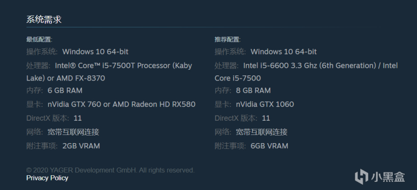 GTX760为最低画质的配置,GTX1060 6G为高画质的配置。
