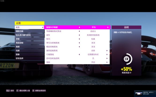 那么,我们再从实际比赛的表现来看一看AMG ONE在游戏中的发挥。下图为作者本人的游戏难度设置,仅供各位看官参考。